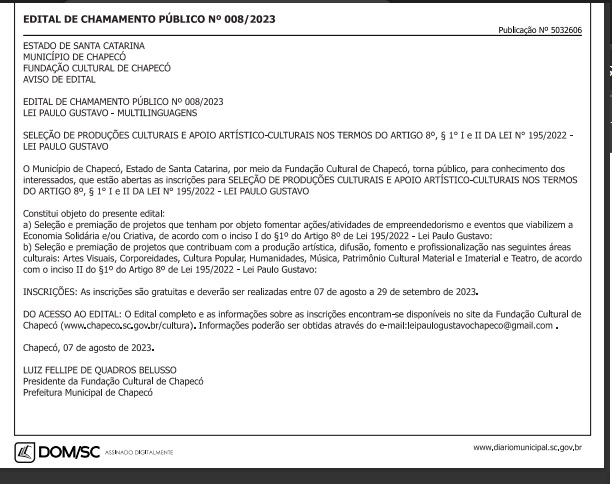EDITAL 008/2023 - LEI PAULO GUSTAVO -ARTIGO 8°: MULTILINGUAGENS