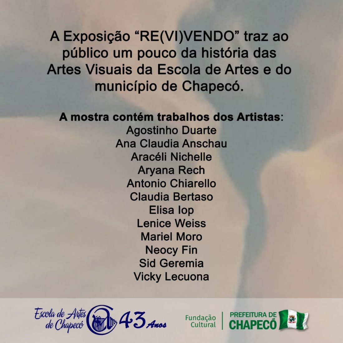 As obras expostas fazem parte da história da Escola de Artes e da história das artes visuais de Chapecó. Muitos destes trabalhos pertencem ao acervo de memória visual do município. A mostra é composta pelos trabalhos dos artistas: Agostinho Duarte, Ana Claudia Anschau, Antonio Chiarello, Aracéli Nichelle, Aryana Rech, Claudia Bertaso, Elisa Iop, Lenice Weiss, Mariel Moro, Neocy Fin, Sid Geremia e Vicky Lecuona.