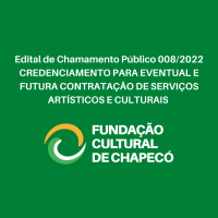 A Fundação Cultural de Chapecó divulgou hoje o Edital de Credenciamento para Eventual e Futura Contratação de Serviços Artísticos e Culturais. O mecanismo, que inicia as inscrições no próximo dia 11...