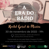 A Prefeitura Municipal de Chapecó, por meio da Fundação Cultural de Chapecó, com organização da Escola de Artes de Chapecó e apoio da Rádio Chapecó, promovem o Recital Geral de Música – A Era do Rádio,...