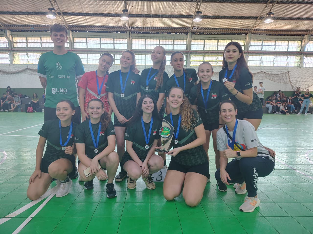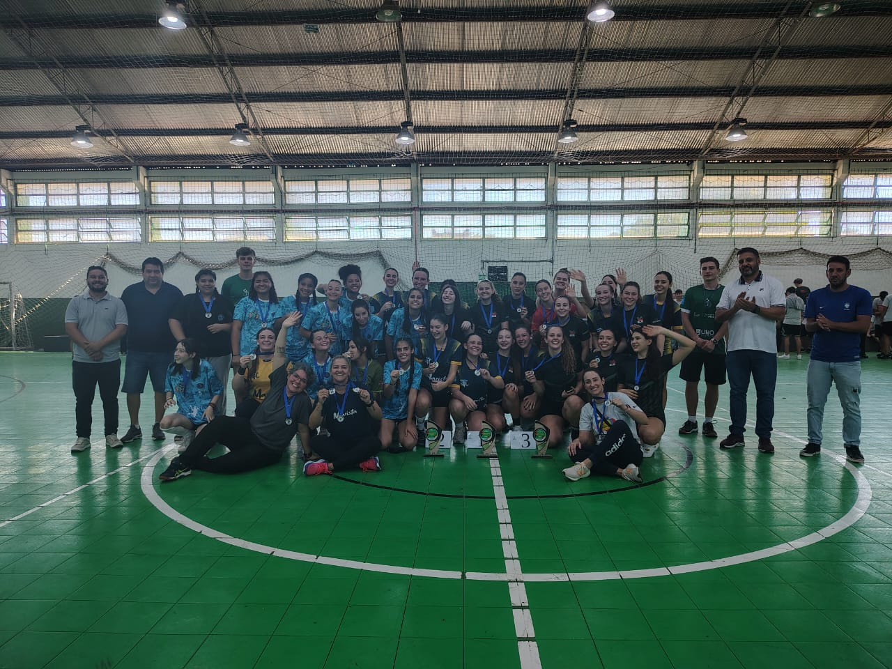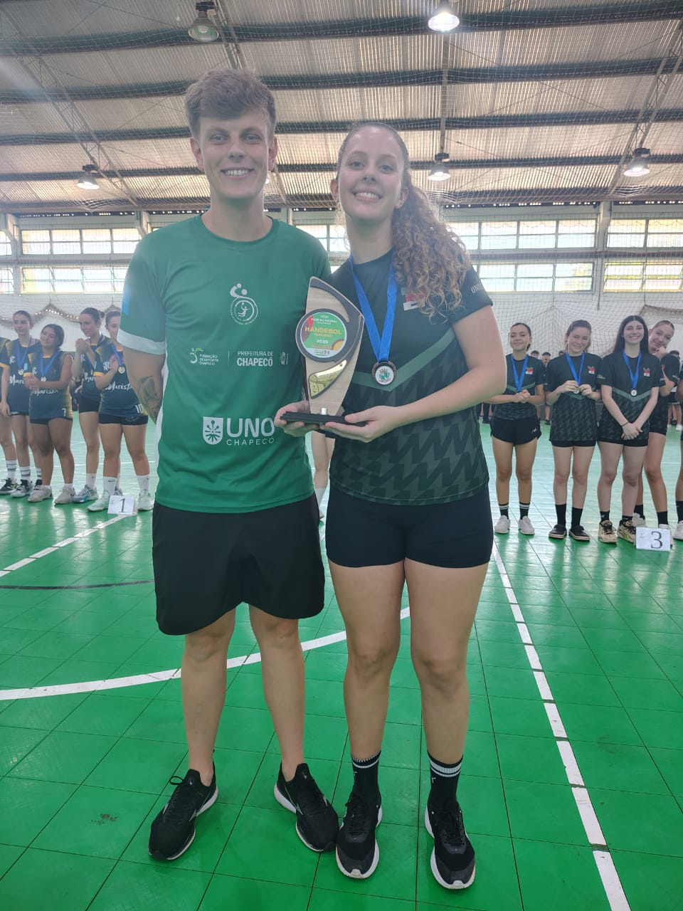 Nesta segunda-feira (24), o Colégio Marista São Francisco teve um dia de grandes conquistas na modalidade de Handebol durante a fase municipal dos Jogos Escolares de Santa Catarina (JESC). Pela manhã, o time feminino da categoria 15 a 17 anos garantiu o título ao vencer a EEB Druziana Sartori na final por 12x05, após derrotar o IFSC nas semifinais por 10x03. A EEB Druziana havia vencido o Colégio Unochapecó por 10x08 na outra semifinal. Na disputa pelo terceiro lugar, a Unochapecó venceu o IFSC por 05x03.