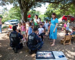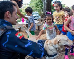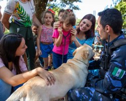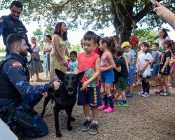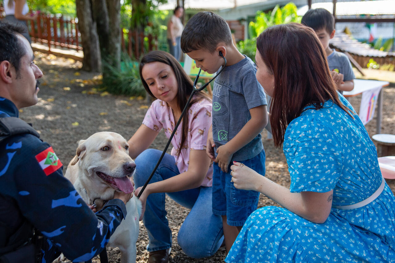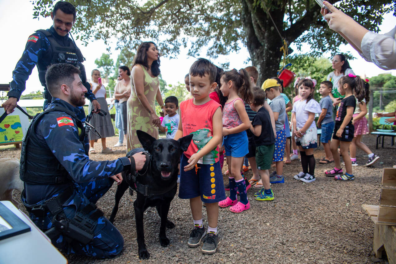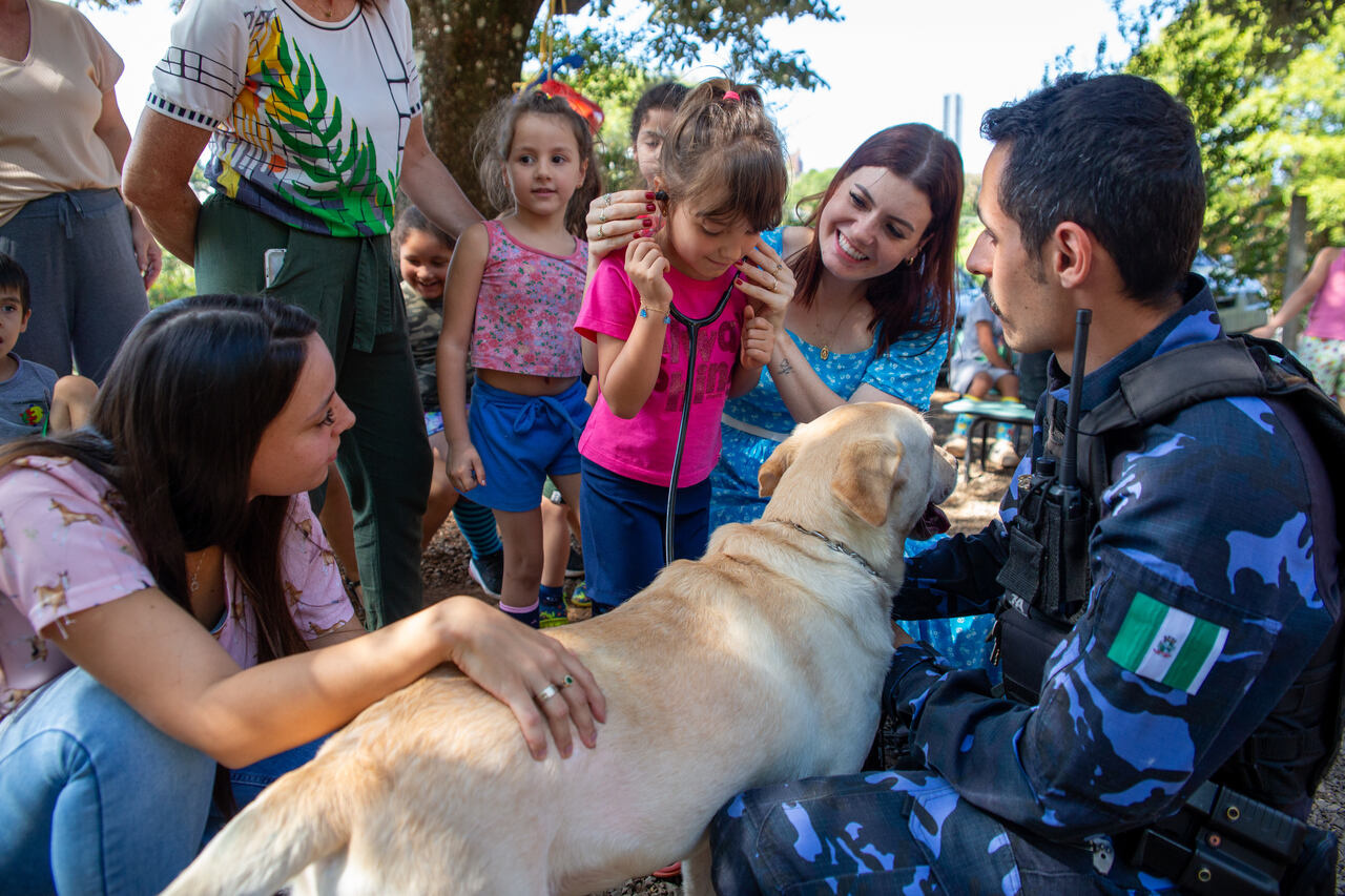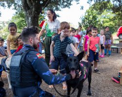 A atividade desenvolvida no parque do CEIM contou com a presença da Guarda Municipal e dos cães Pantera e Sky, que demonstraram como os animais contribuem para o serviço de segurança pública. Além disso, a médica veterinária Rafaela Garcia Bet, conversou com os pequenos sobre a profissão dela e mostrou alguns materiais utilizados por ela no dia a dia.