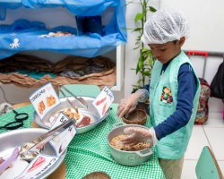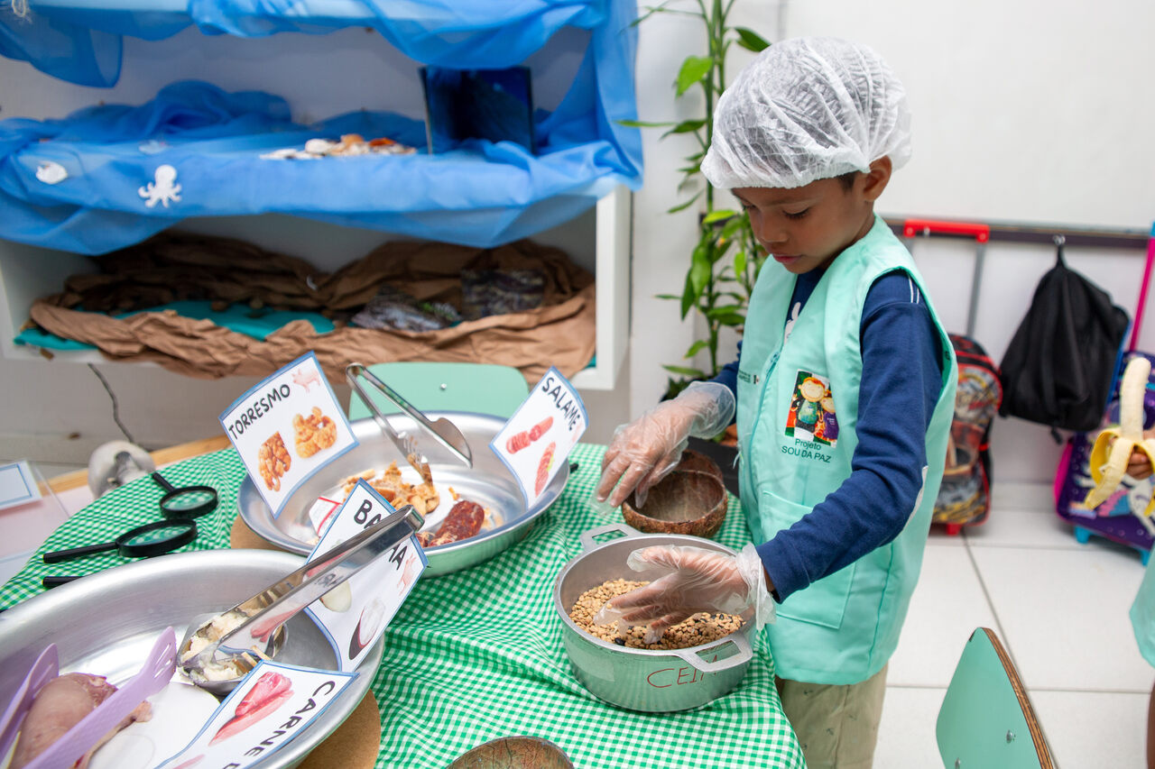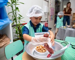 Organizamos esse ambiente para que as crianças tivessem contato com diferentes texturas, cores e aromas, além de permitir que elas experimentassem os diversos sabores presentes nos alimentos, explicou a professora Léia.