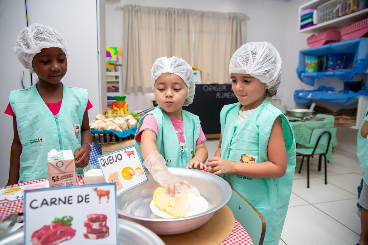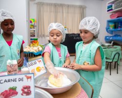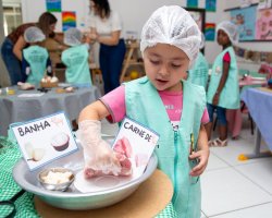 A turma de pré-escola, da professora Léia Trindade, do Centro de Educação Infantil Municipal Nossos Sonhos, realizou uma investigação em sala de aula para descobrir as origens dos alimentos, tanto vegetal quanto animal.