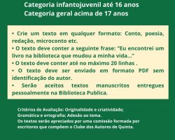 O prazo para inscrição encerra às 18h de quinta-feira (10). Os textos podem ser enviados por PDF, no whatsapp (49) 2049-9002 ou presencialmente na Biblioteca. Também podem ser entregues textos manuscritos, presencialmente.