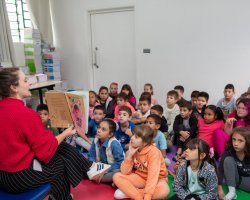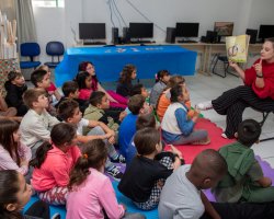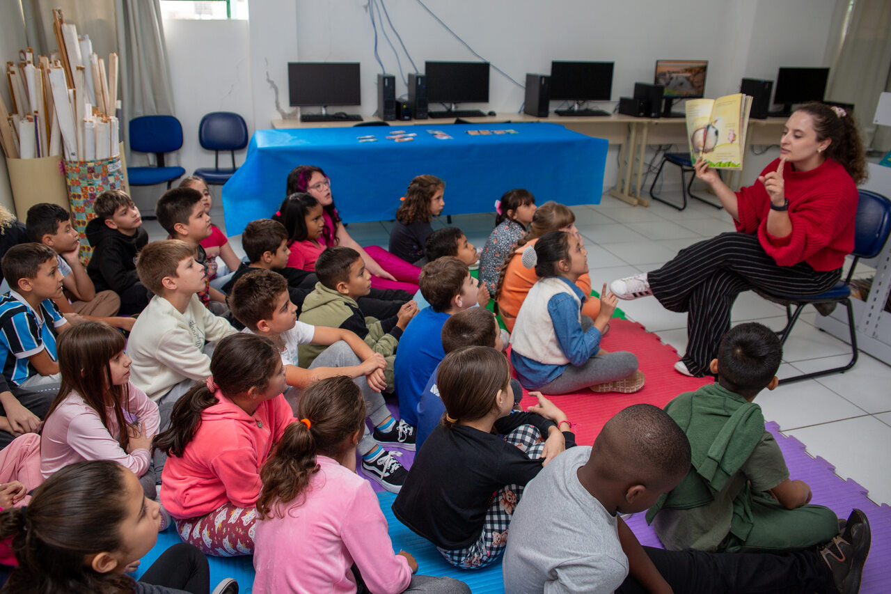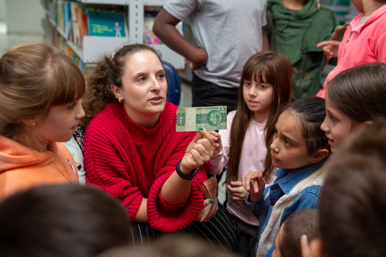 A professora Luana Possebon, responsável pelo componente curricular, explicou como o momento da contação da história Camilão, o comilão foi organizado e qual o objetivo dele. Com essa atividade, as crianças puderam exercitar a memória, participar da contação e relembrar conceitos sobre o dinheiro, o nome das moedas, entender que há diferenças entre as quantidades impressas nas notas e como o dinheiro é utilizado no dia a dia, disse.