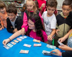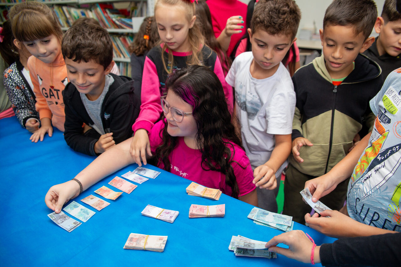 Os estudantes de uma turma de terceiro ano, da Escola Básica Municipal Jardim do Lago, estão aprendendo sobre quantidades e os conceitos de maior e menor através das aulas de Educação Financeira. Além disso, as crianças têm a oportunidade de visualizar a moeda nacional - o real - e refletir sobre os valores das notas e como são utilizadas em nosso cotidiano.
