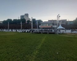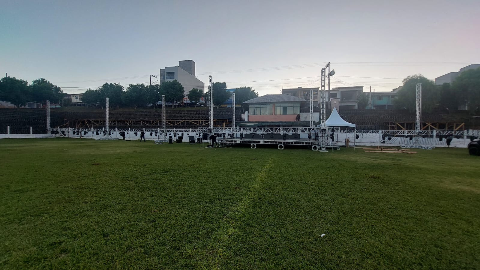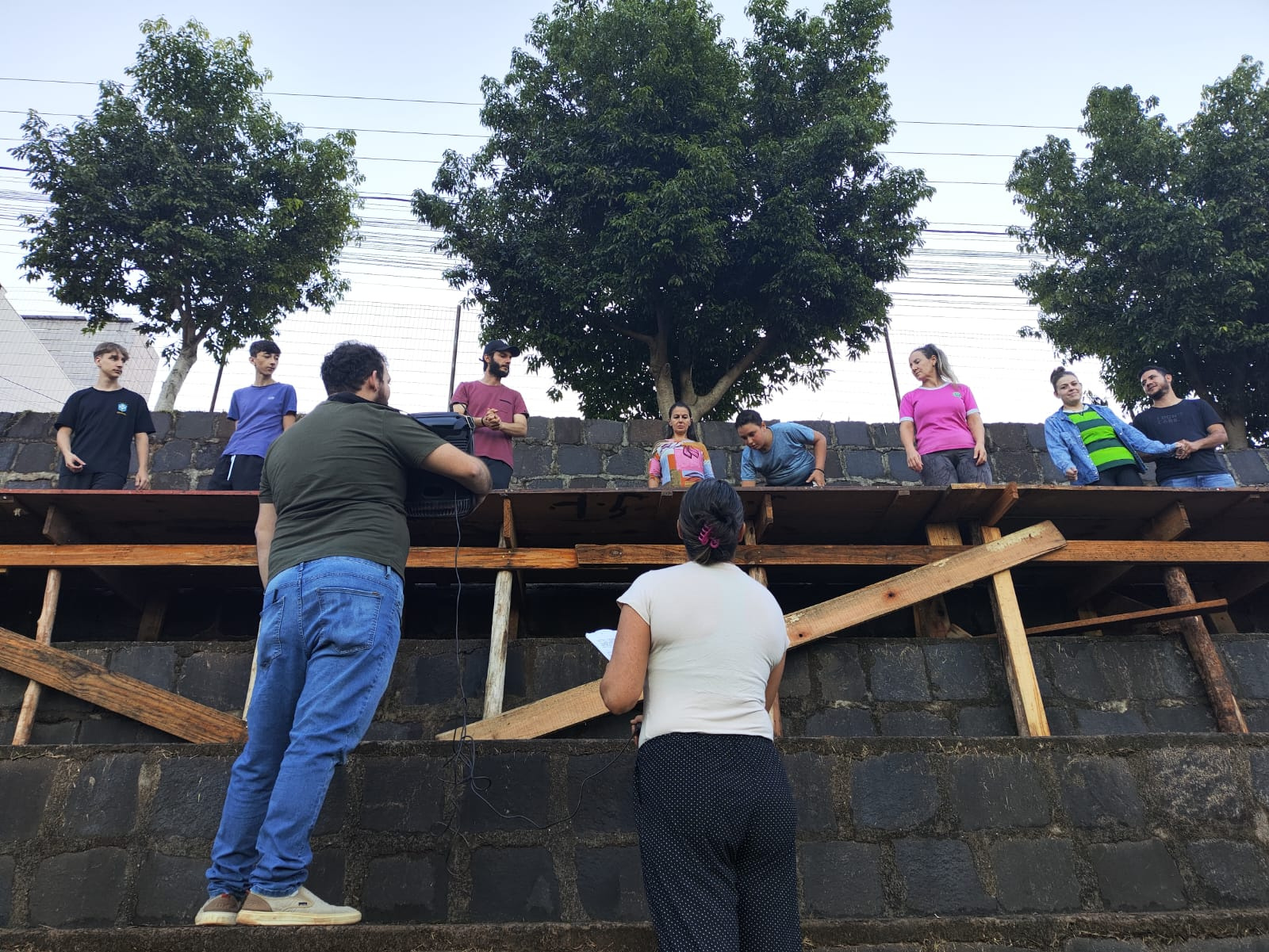 O barulho do martelo na montagem dos palcos para a realização do teatro ecoa pelo Bairro Efapi. Junto com ele também o vento faz a sua parte na limpeza das folhas das árvores que caem nas arquibancadas do campo do Jardim do Lago, uma das melhores estruturas esportivas de Chapecó, que desta vez deixa o futebol de lado para receber o espetáculo da Paixão e Morte de Cristo.
