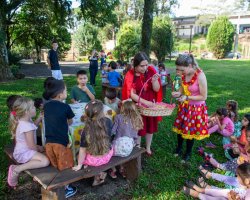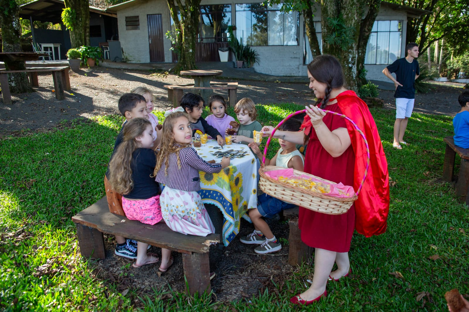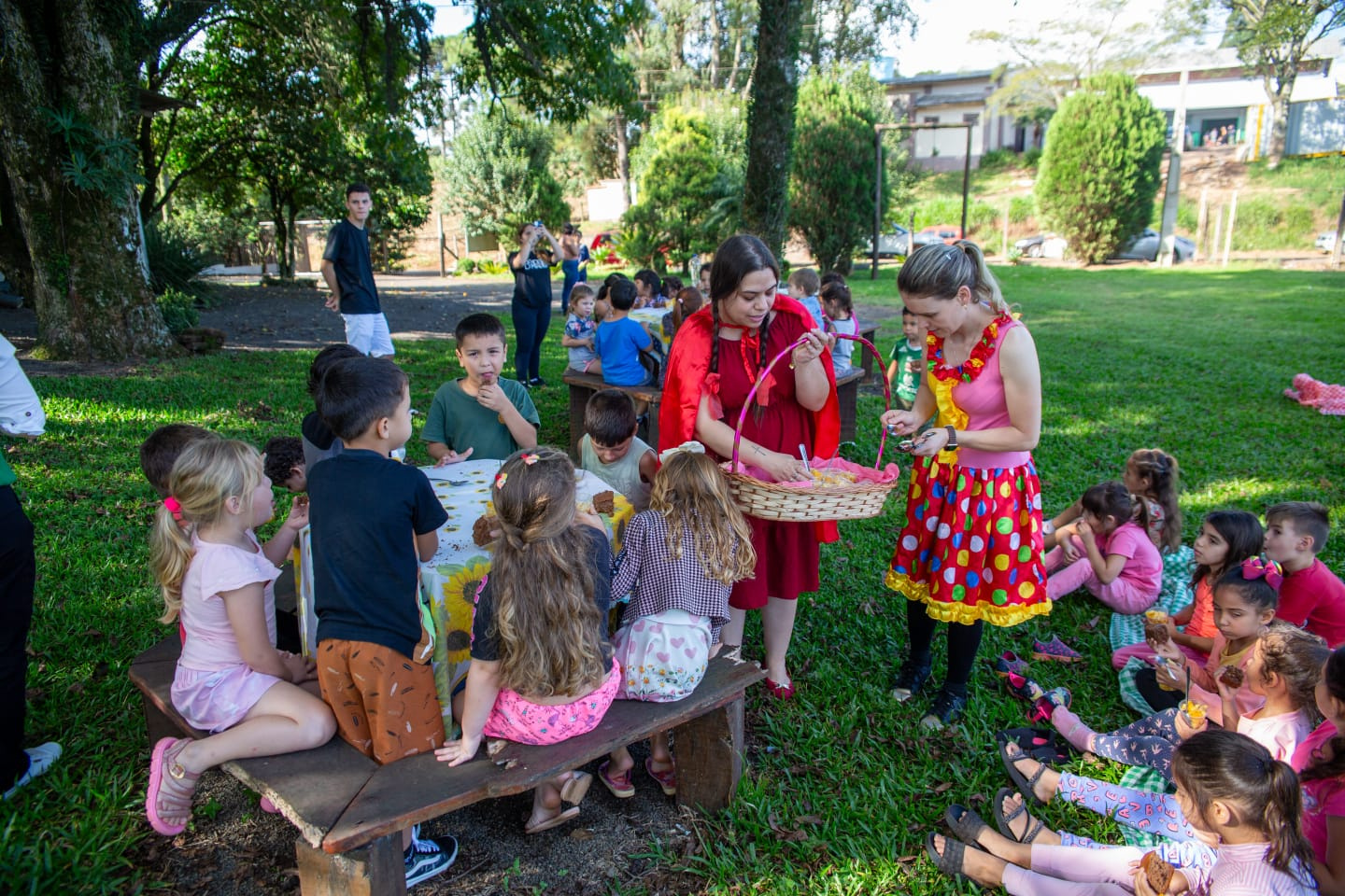 piquenique e comer bolo e salada de frutas com meus amigos. Nataly, por sua vez, elogiou a caracterização das professoras para contar as histórias. Foi muito legal ver as professoras vestidas de chapeuzinho vermelho e de palhaça enquanto contavam as histórias da Chapeuzinho vermelho e do João e o pé de feijão. Eu gostei do piquenique