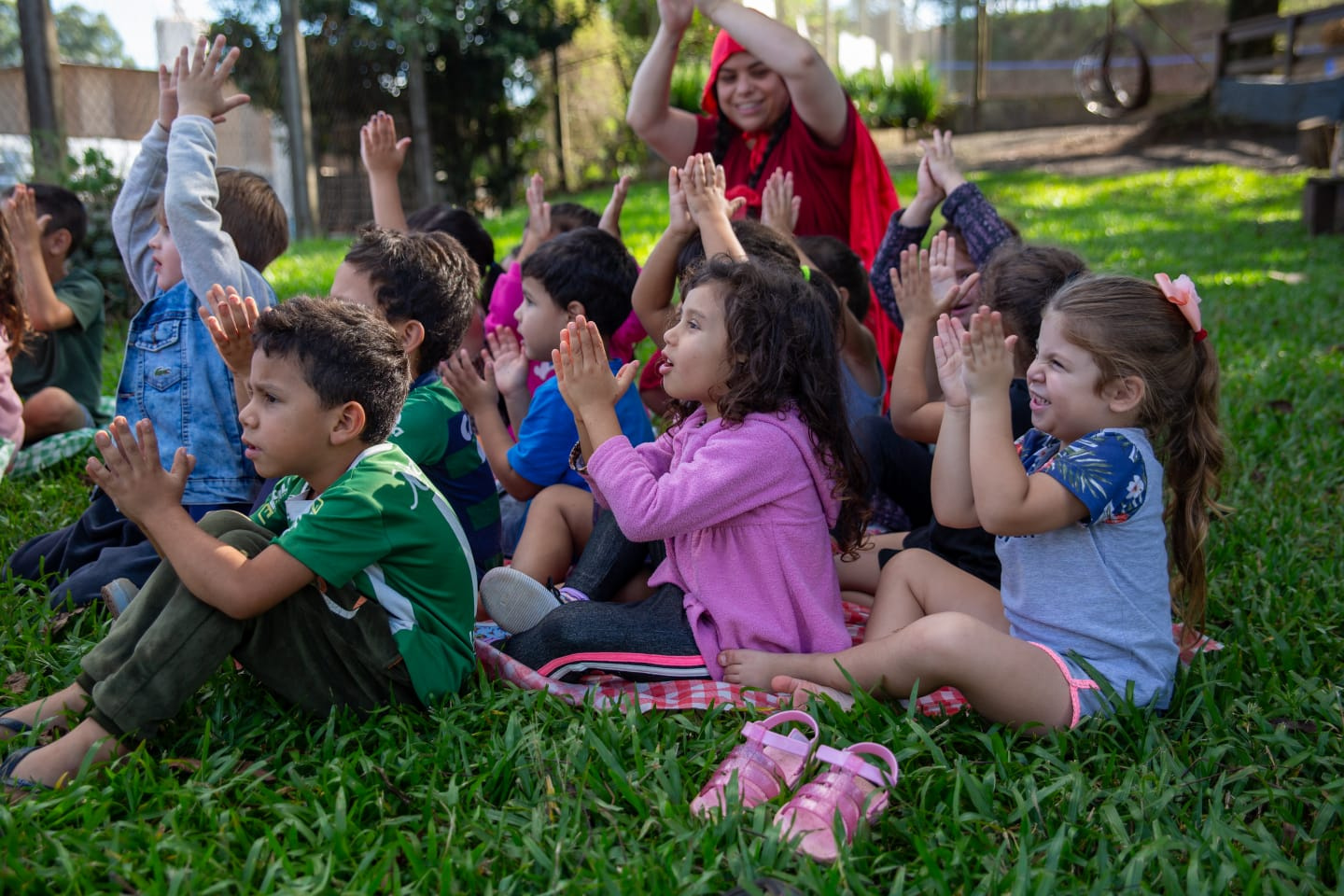 Além disso, as duas turmas vivenciaram um piquenique e os participantes Benjamim Canali e Nataly Alves expuseram as opiniões sobre a experiência. Eu gostei muito de vir aqui debaixo das árvores para ouvir as histórias. Também fiquei feliz em participar do