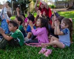 escola, um piquenique literário. Scheila comentou como ela e a colega planejaram a vivência. O nosso objetivo era proporcionar às crianças um momento bem especial de