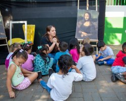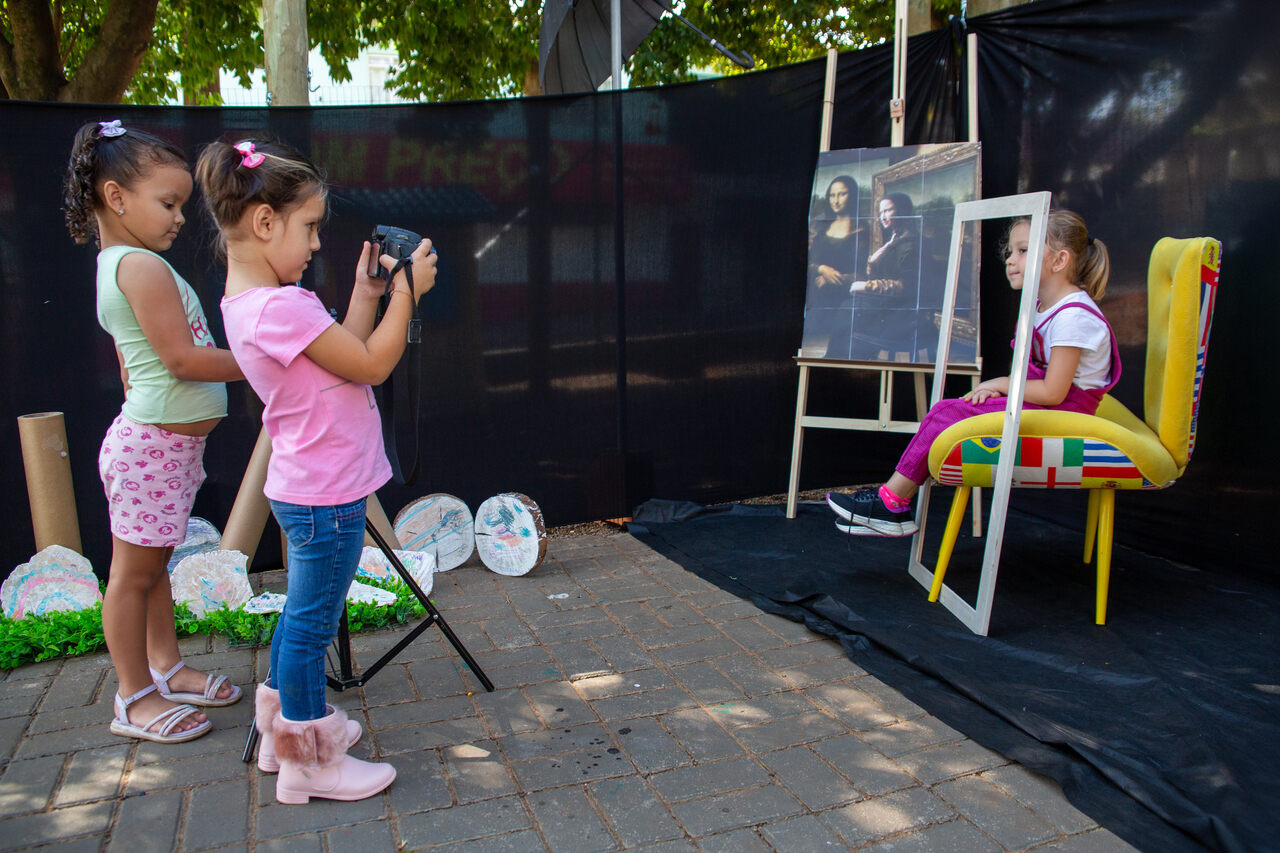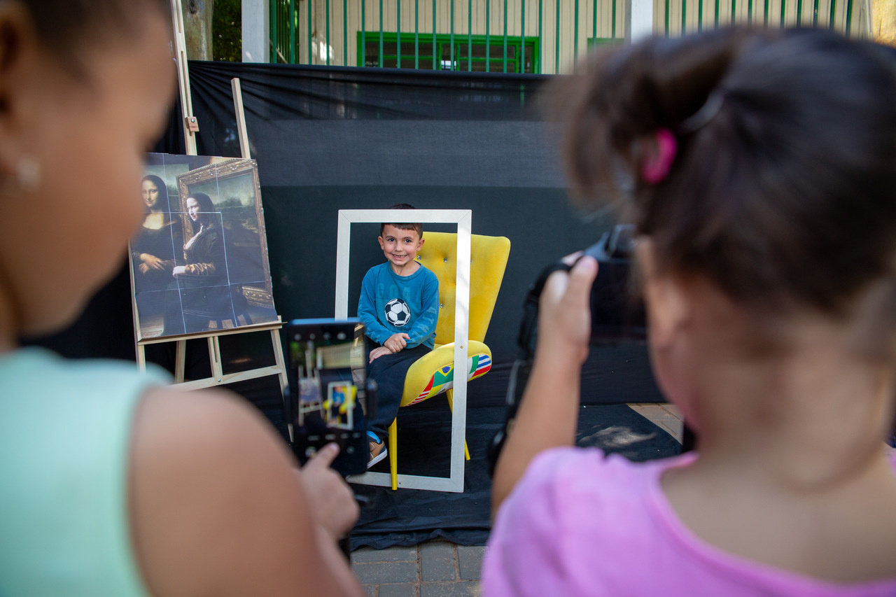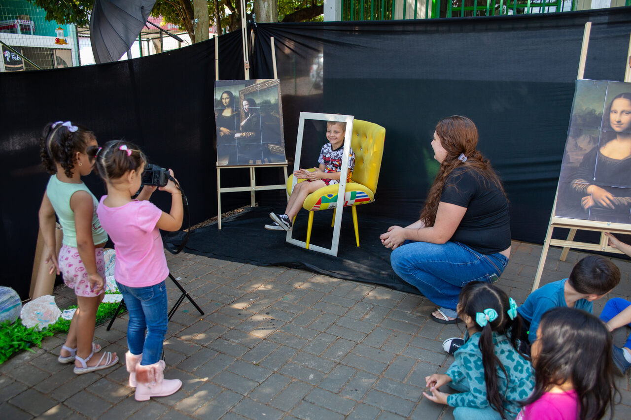 Andressa explicou também o cenário preparado para a atividade no pátio da escola, que incluiu poltrona, moldura e câmera fotográfica. A nossa intenção é que cada criança, uma por vez, reproduza a cena da Mona Lisa e em seu rosto expresse o sentimento que o quadro representa para si própria. Em seguida, duas colegas da turma farão o registro fotográfico do momento. Além disso, após essa etapa, todos poderão desenhar no papel a própria versão da obra, comentou.