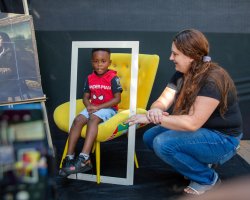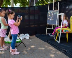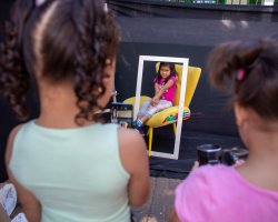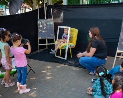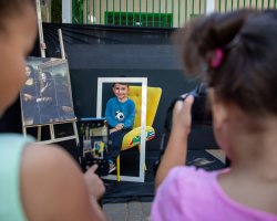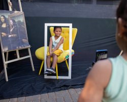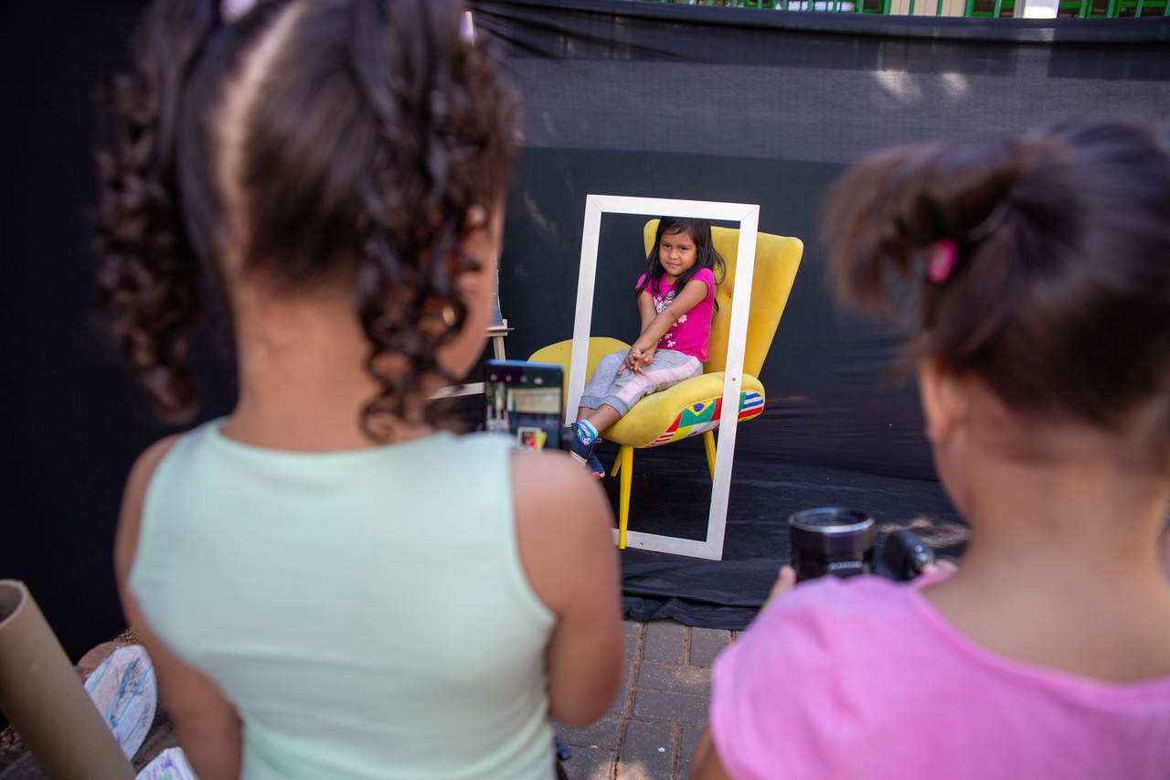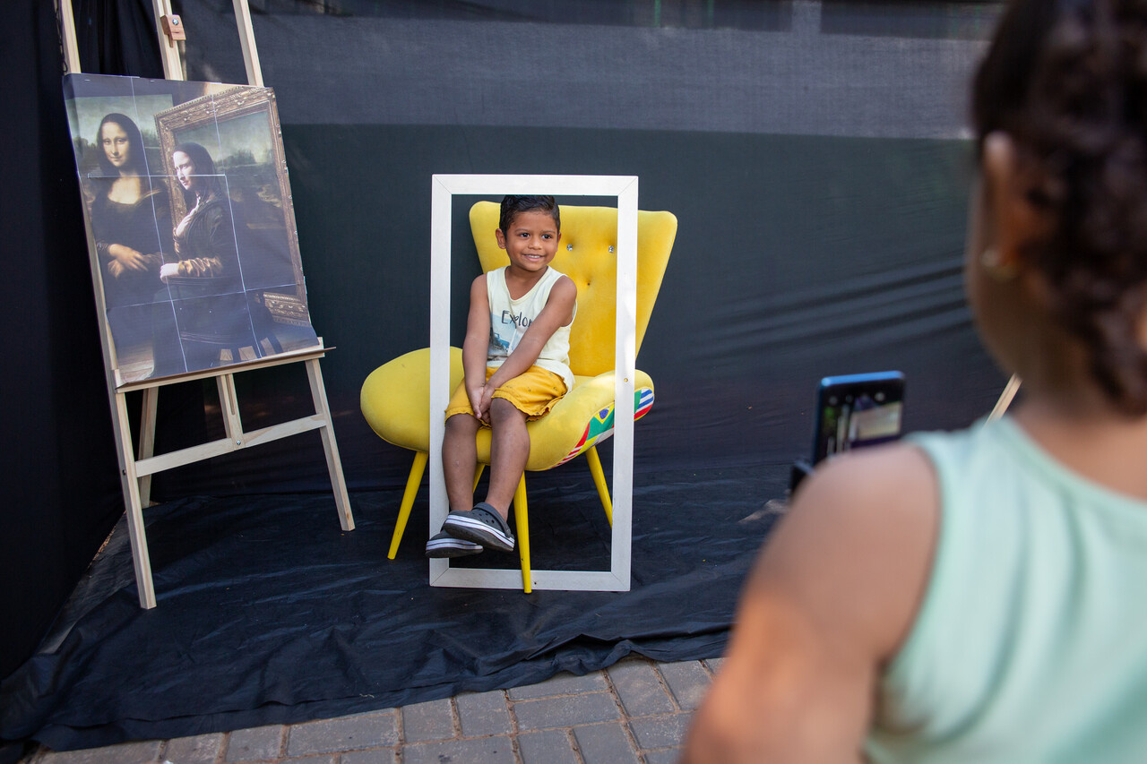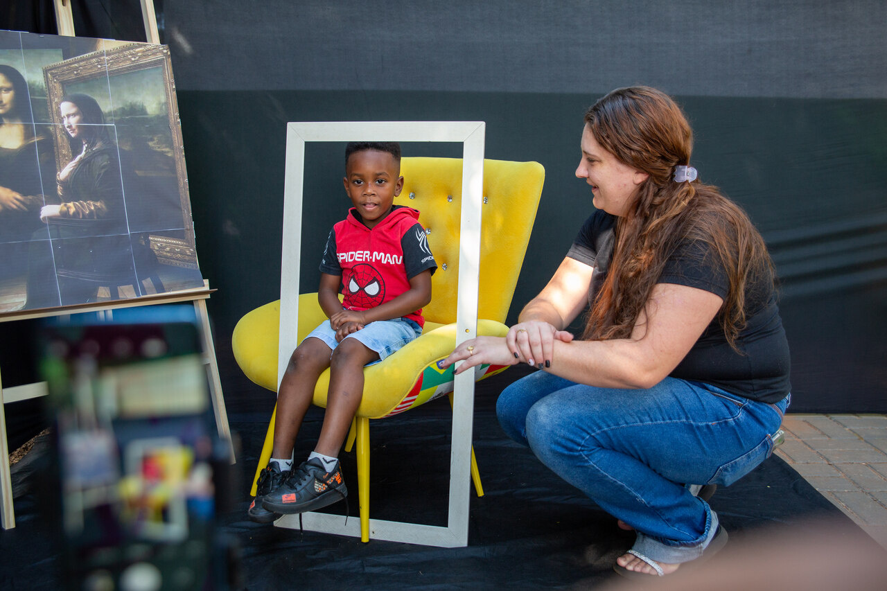 Andressa explicou também o cenário preparado para a atividade no pátio da escola, que incluiu poltrona, moldura e câmera fotográfica. A nossa intenção é que cada criança, uma por vez, reproduza a cena da Mona Lisa e em seu rosto expresse o sentimento que o quadro representa para si própria. Em seguida, duas colegas da turma farão o registro fotográfico do momento. Além disso, após essa etapa, todos poderão desenhar no papel a própria versão da obra, comentou.