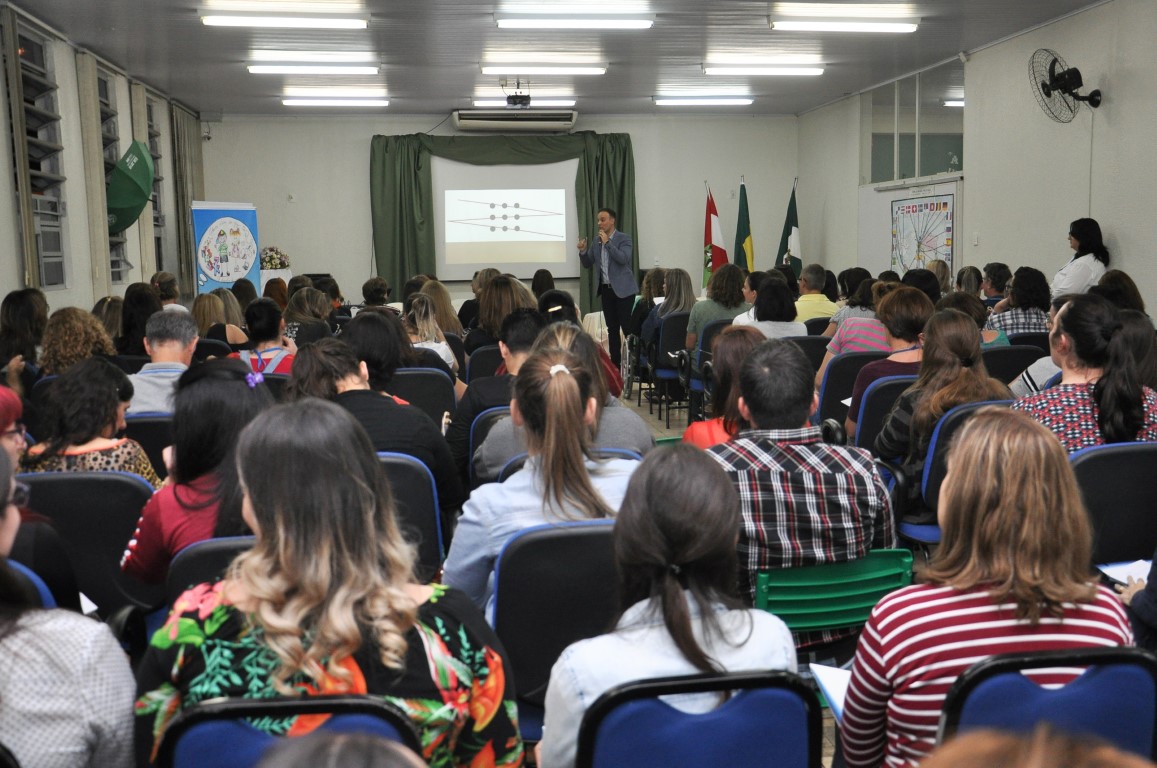 Cerca de 150 profissionais da equipe técnica da Secretaria Municipal de Educação e os professores que atuam na Educação de Jovens e Adultos da Rede Municipal de Ensino de Chapecó, participaram de Palestra Motivacional Sua Marca Relações Interpessoais proferida por Breno Ferigollo Filho, que abordou o tema de forma direcionada aos profissionais da educação presentes com foco no trabalho de equipe.