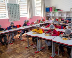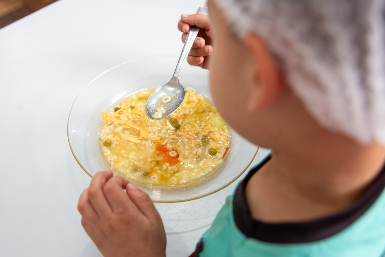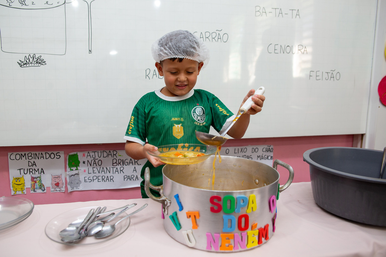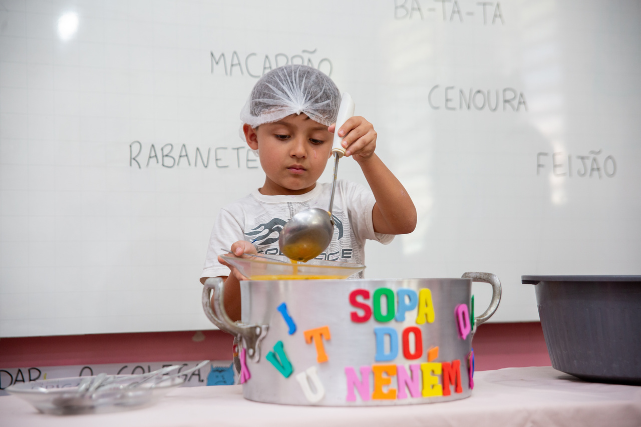 A partir desse cenário, a turma foi convidada pela professora para degustar uma sopa de letrinhas. A professora Patrícia comentou acerca do desenvolvimento da atividade. Nós utilizamos várias estratégias para aprender as letras e realizar tentativas de escrita. Hoje, com a degustação da sopa de letrinhas, estamos concretizando mais uma ação, na qual as crianças conversaram sobre os ingredientes que eles encontraram na sopa, quais eles consomem em casa, observaram as letras presentes na sopa e pensaram sobre quais outras palavras eles conhecem que iniciam com as letras presentes na sopa, explicou.