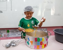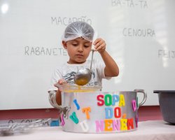 Nós ouvimos a música sopa do neném, identificamos os ingredientes que são mencionados na canção e comparamos com aqueles presentes na sopa que degustamos. Além disso, observamos várias letrinhas na sopa e comentamos com a professora as palavras que conhecemos e que começam com cada letra, disse Anthony Samuel Verlinda da Rocha, que participou da atividade.