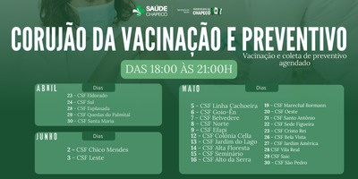 A Prefeitura de Chapecó, por meio da Atenção Básica da Secretaria de Saúde, realiza nesta semana o "Corujão de Vacinação e Preventivo", com terceiro turno, das 8h às 21h, nas unidades da Linha Cachoeira nesta segunda-feira (5), Goio-Ên na terça-feira (6), Belvedere na quarta-feira (7), Norte na quinta-feira (8) e Efapi na sexta-feira (9). De acordo com o secretário de Saúde, João Lenz, essa ação inovadora implementa um terceiro turno mensal nas unidades básicas de saúde, com o objetivo de ampliar o acesso das mulheres aos serviços essenciais de saúde, como a coleta de exames preventivos para o câncer de colo do útero e a solicitação de mamografias.