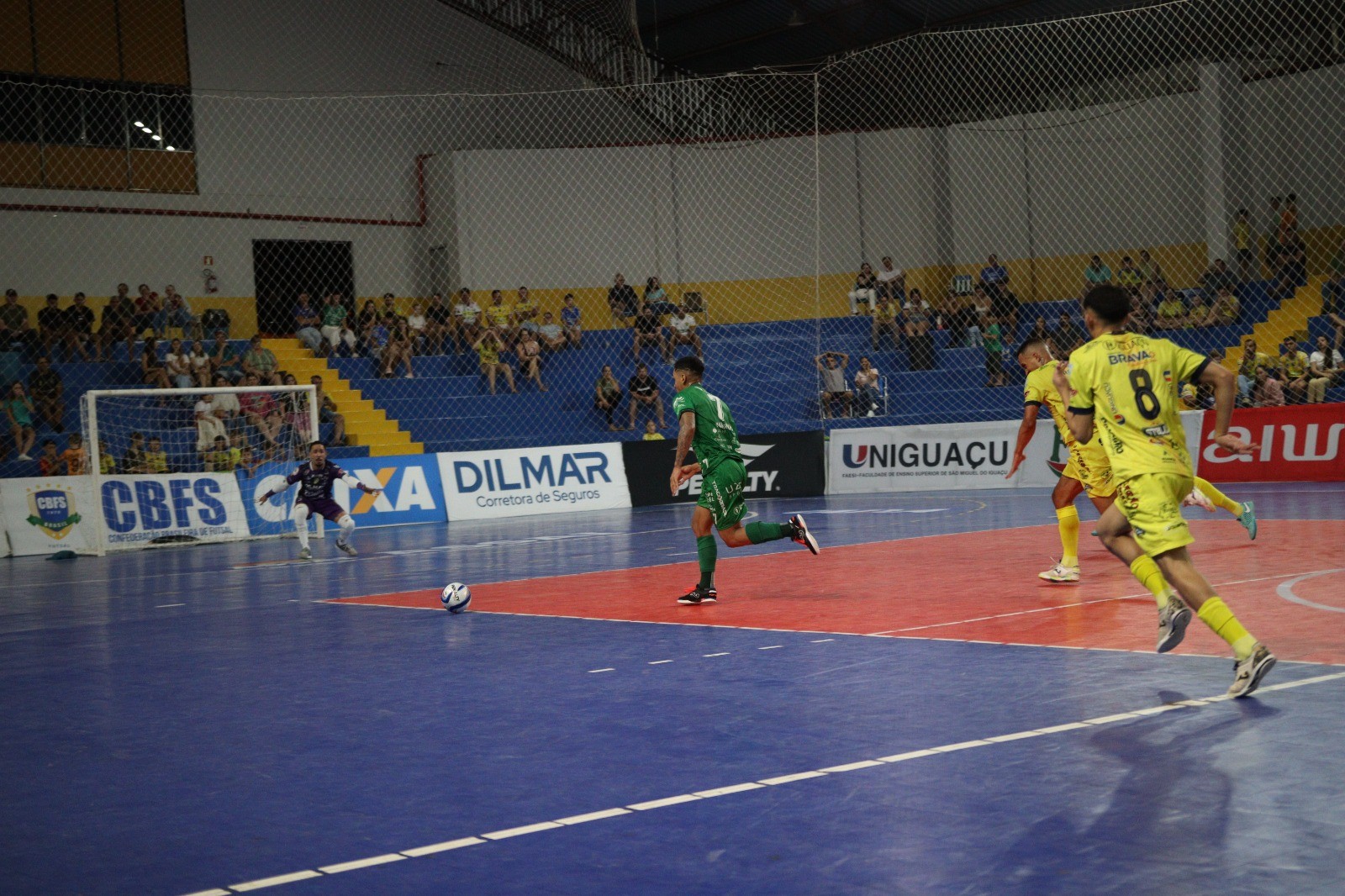 O primeiro gol da Chape Futsal no Brasileiro foi anotado pelo camisa 10. O ala Kassula arriscou do meio da quadra, ainda no campo de defesa, e acertou belo chute no ângulo. Eram jogados 1320 do primeiro tempo. Antes, o goleiro Dudu defendeu um pênalti aos 836, evitando que os anfitriões abrissem o placar. Os donos da casa igualaram aos 10 da segunda etapa, com Formiga.