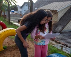 Uma turma de quinto ano, da EBM São Cristóvão, da professora regente, Janete de Farias, realizou uma caça ao tesouro dos textos, que consistiu em encontrar os textos dispostos na área externa da escola e identificar a qual gênero textual eles pertenciam.