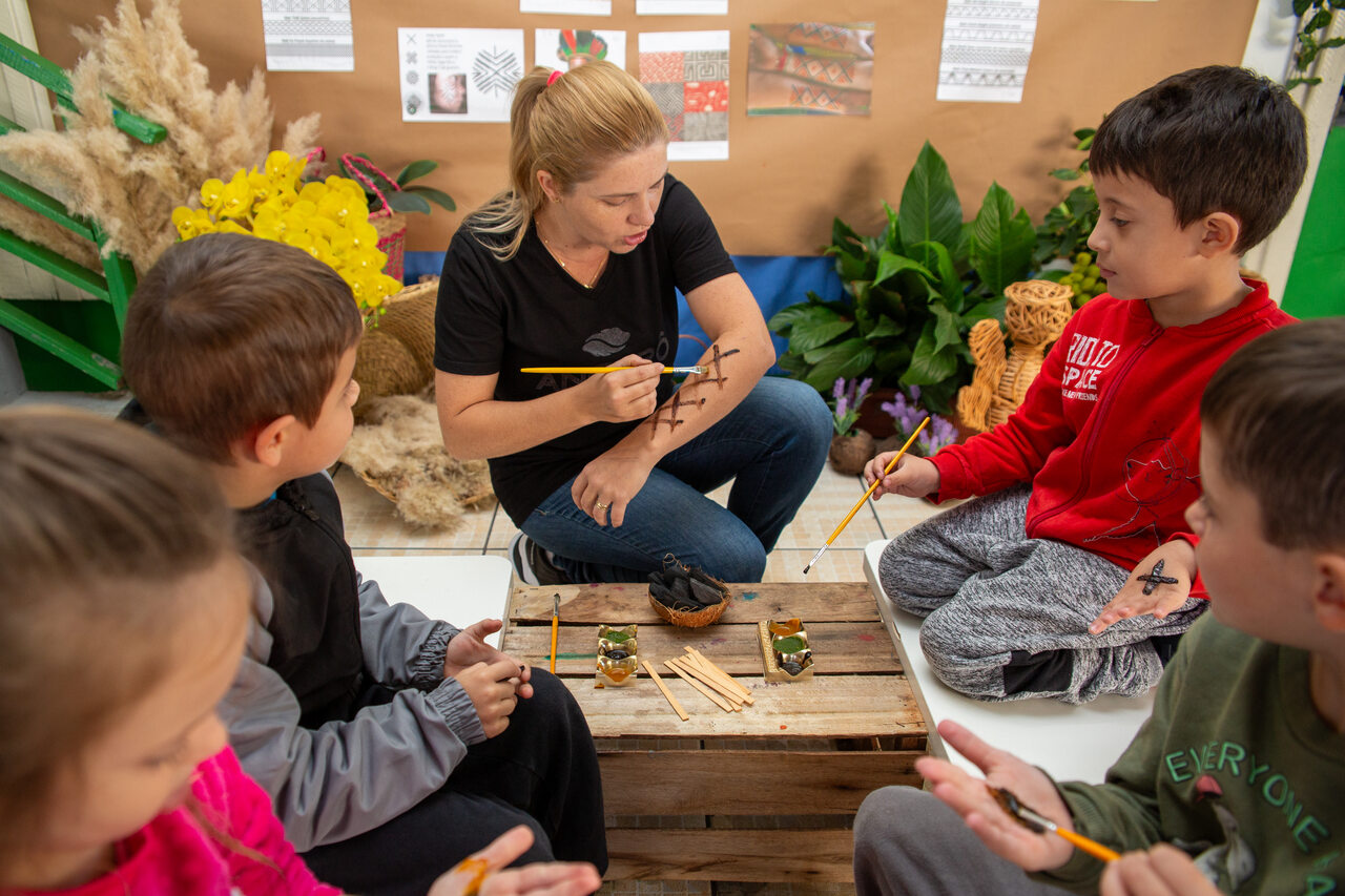No Centro de Educação Infantil Cantinho da Imaginação, a professora de Arte Luciane Lippert Gonçalves propôs para a turma de pré-escola uma experiência relacionada à Cultura Indígena e ao uso das tintas naturais.
