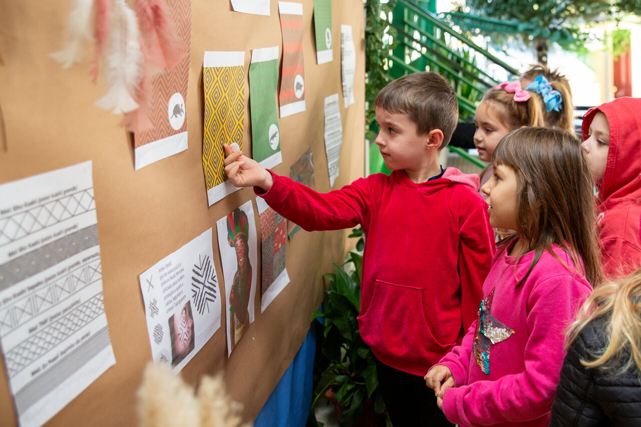 A família também foi convidada a participar da atividade, enviando para a instituição algum objeto da cultura indígena para a exposição. As crianças conversaram com os pais em casa e algumas delas trouxeram para a aula objetos e artesanatos que tinham em casa, enquanto outras, pesquisaram e construíram com a família utensílios utilizados na cultura indígena. Esse gesto enriqueceu ainda mais a nossa prática, complementou a professora.