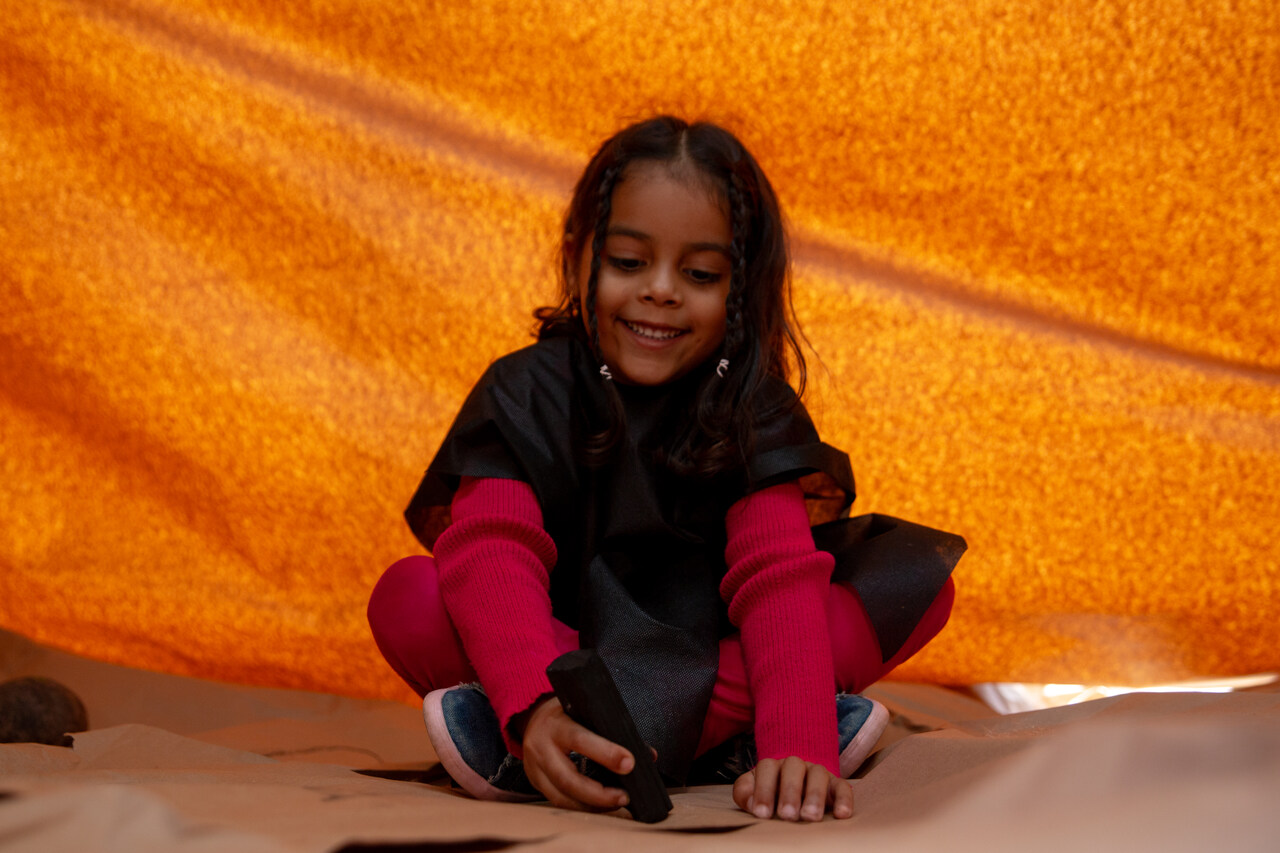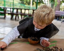 Para o momento, a professora, juntamente com a equipe pedagógica organizaram na área coberta do espaço educativo, uma caverna feita a partir de papel pardo e itens utilizados pelos povos primitivos para realizar contagens. Nesta atividade, as crianças puderam vivenciar como as pessoas, na antiguidade, utilizavam gravetos, pedrinhas, carvão e nós em cordas para representar as quantidades dos frutos que eram colhidos e dos animais que eram caçados. Enquanto realizavam a contagem, eu os auxiliava para que falassem os números em inglês, reiterou Jéssica.