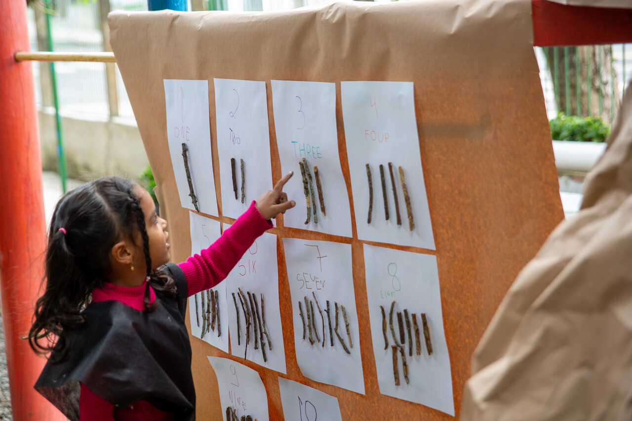 De acordo com Jéssica, a iniciativa de trabalhar com essa temática partiu da curiosidade das crianças. Eu sempre início as aulas de Língua Inglesa com uma música e, em seguida, faço a contagem de quantas crianças estão presentes no dia. Esse ato despertou o interesse da turma em aprender a contar em inglês. Por isso, decidi propor uma vivência relacionada à descoberta do contar e o surgimento dos números, explicou.