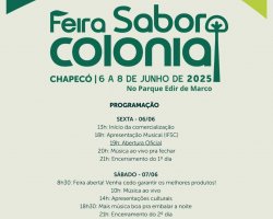 A Feira Sabor Colonial inicia a comercialização às 13h de sexta-feira (6), com abertura oficial às 19h e encerramento às 21h. No sábado (7), a programação vai das 8h30 às 21h. No domingo, a abertura é às 9h e o encerramento às 16h.