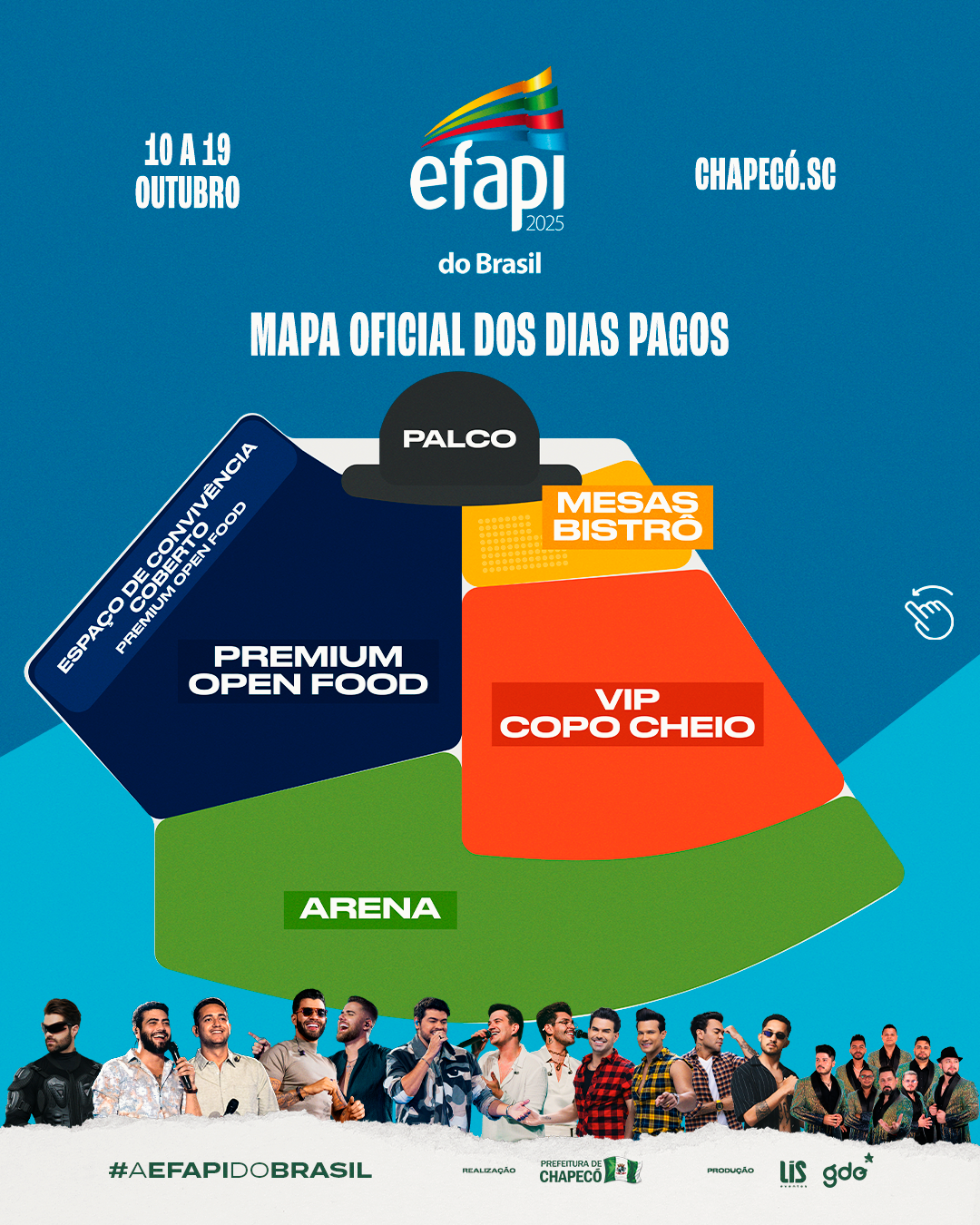 Os quatro shows pagos da Efapi 2025 são os seguintes: 11 de outubro - Hugo e Guilherme + Os Caras do Arrocha e Grelo; 12 de outubro - Zé Neto & Cristiano + Corpo & Alma; 17 de outubro - Gusttavo Lima e 18 de outubro - Alok + Henrique & Juliano.
