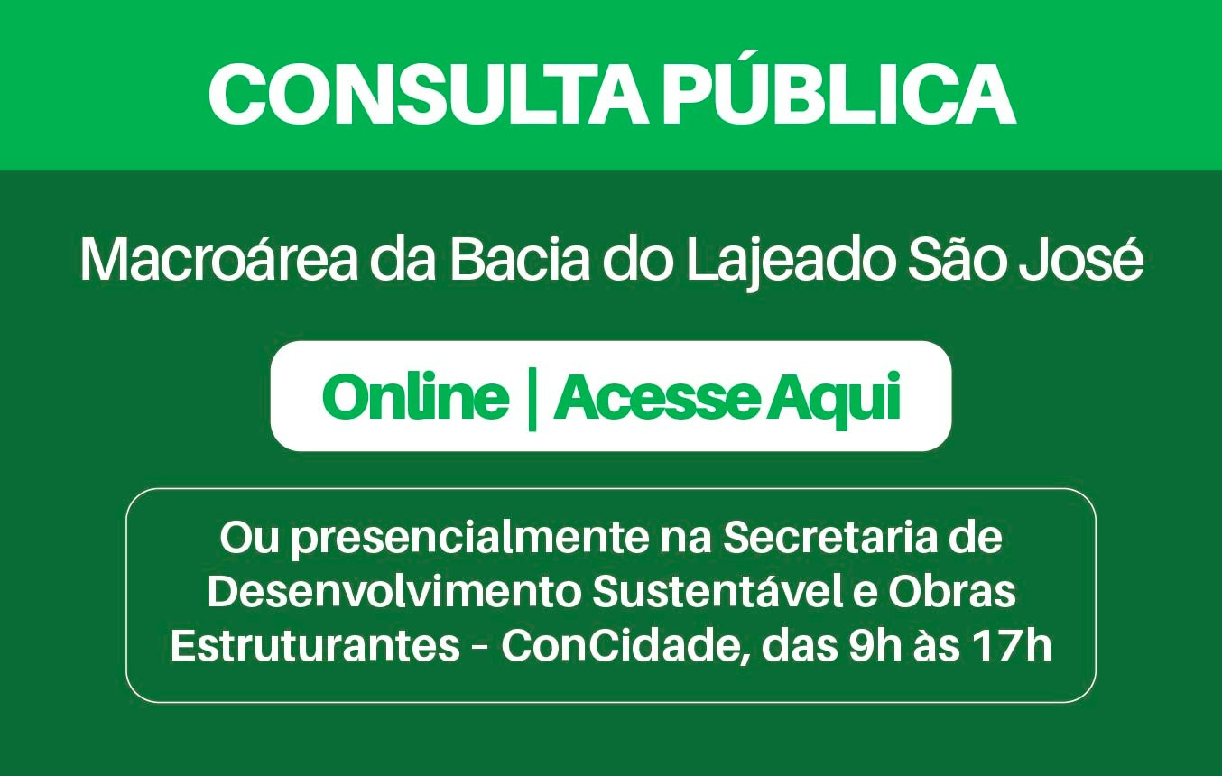 Também é possível encaminhar sugestões presencialmente na Secretaria de Desenvolvimento Sustentável e Obras Estruturantes, no setor do ConCidade, das 9h às 17h.
