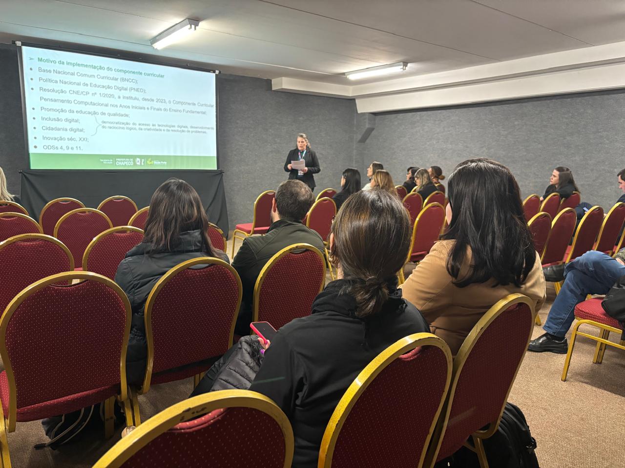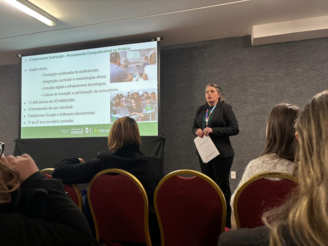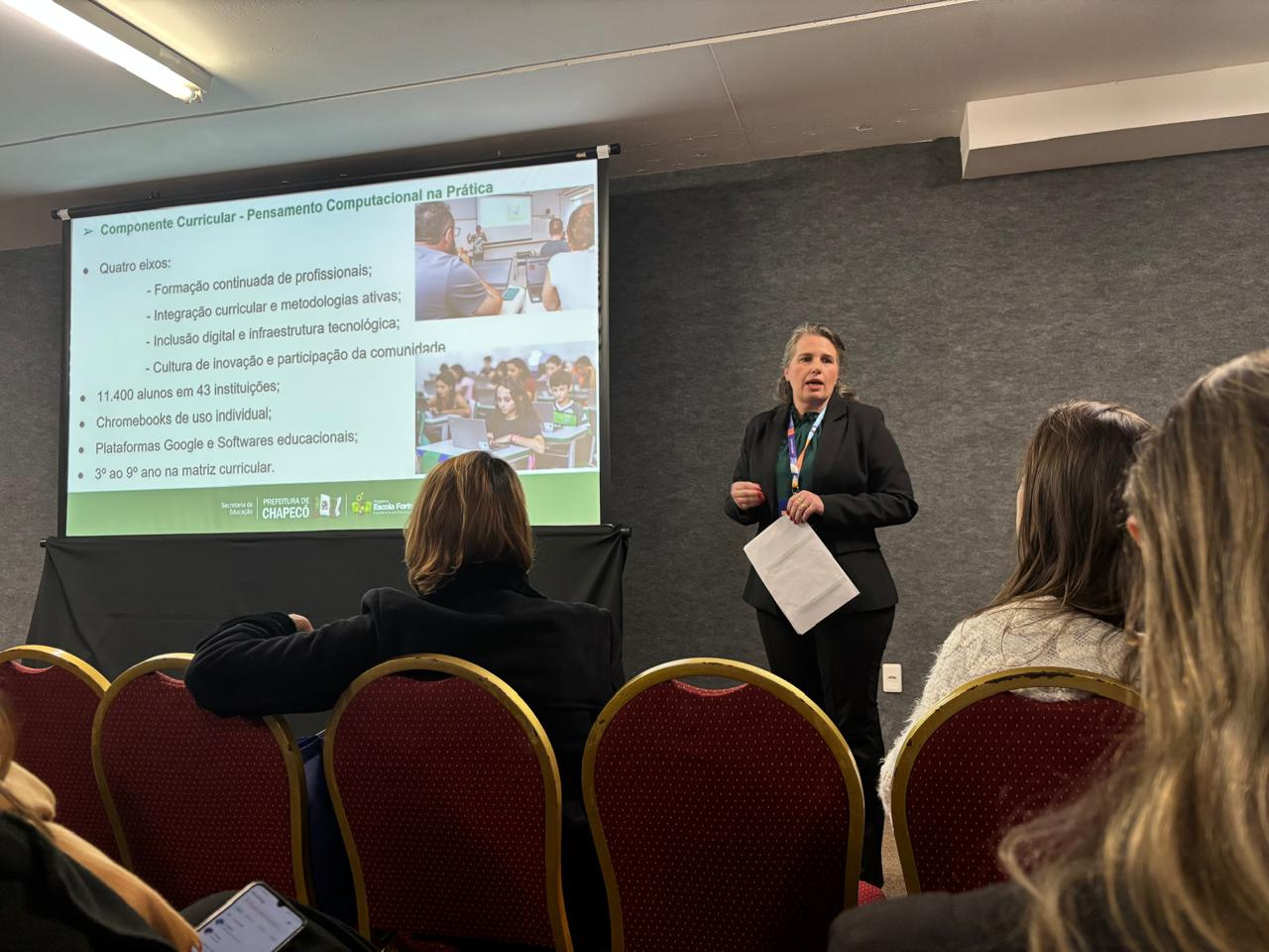 Na terça-feira (24/06), a gerente do Ensino Fundamental, Sabhrina Frigeri, representou a Secretária de Educação, Astrit Tozzo, durante a apresentação de um relato sobre a promoção da educação e inclusão digital na Rede Municipal de Ensino. O destaque da comunicação foi o componente curricular de Pensamento Computacional, utilizado como uma estratégia inovadora para ampliar o acesso à cultura digital e fortalecer a aprendizagem nas escolas de Chapecó.