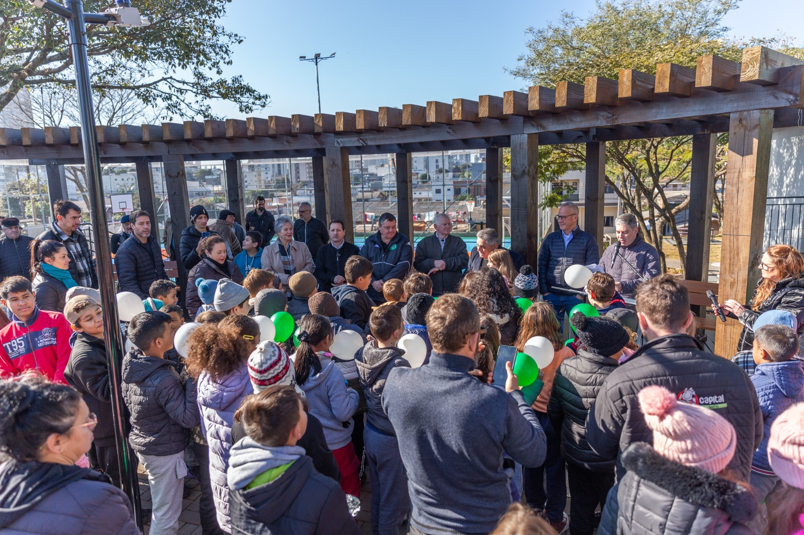 A Prefeitura de Chapecó realizou na manhã desta quinta-feira (3) a inauguração da revitalização da praça Paulo Marques, no bairro São Cristóvão. O investimento foi de R$ 2,9 milhões e consistiu na retirada da camada de vegetação, demolição da quadra antiga e passeios em pedra para a construção da nova quadra poliesportiva, playground, espaço para piquenique, espaço para jogos de tabuleiro, pergolados, passeios em paver, rampa, escadas e academia ao ar livre.