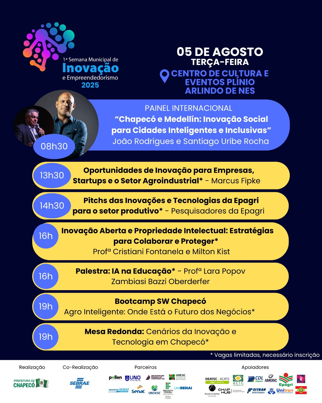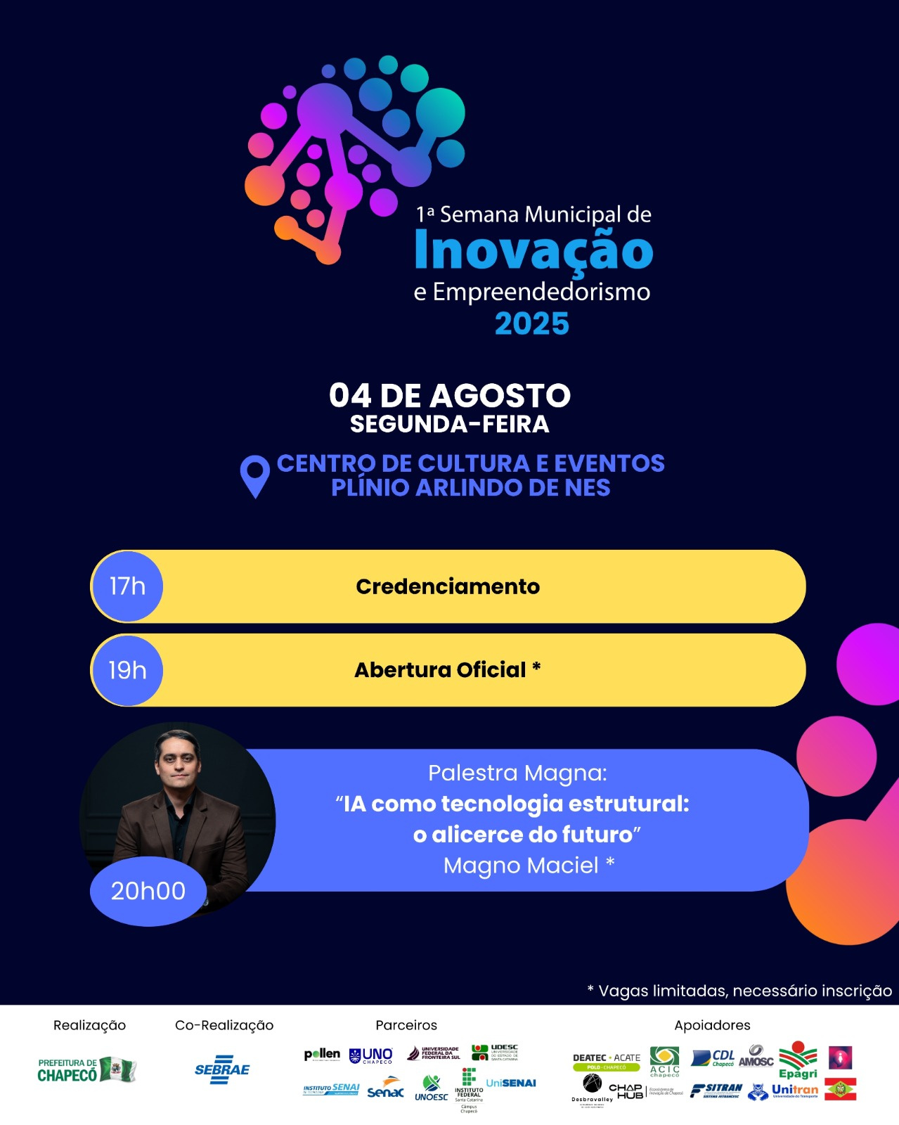 O secretário de Desenvolvimento Econômico, Turismo e Inovação, Márcio da Paixão Rodrigues, disse que no evento serão apresentadas as principais inovações desenvolvidas pela Prefeitura de Chapecó, com destaque para o programa estratégico Chapecó Inovadora. Queremos aproximar pessoas, instituições e soluções, promovendo conexões entre setores estratégicos e respondendo a desafios concretos do território com criatividade, tecnologia e impacto social.