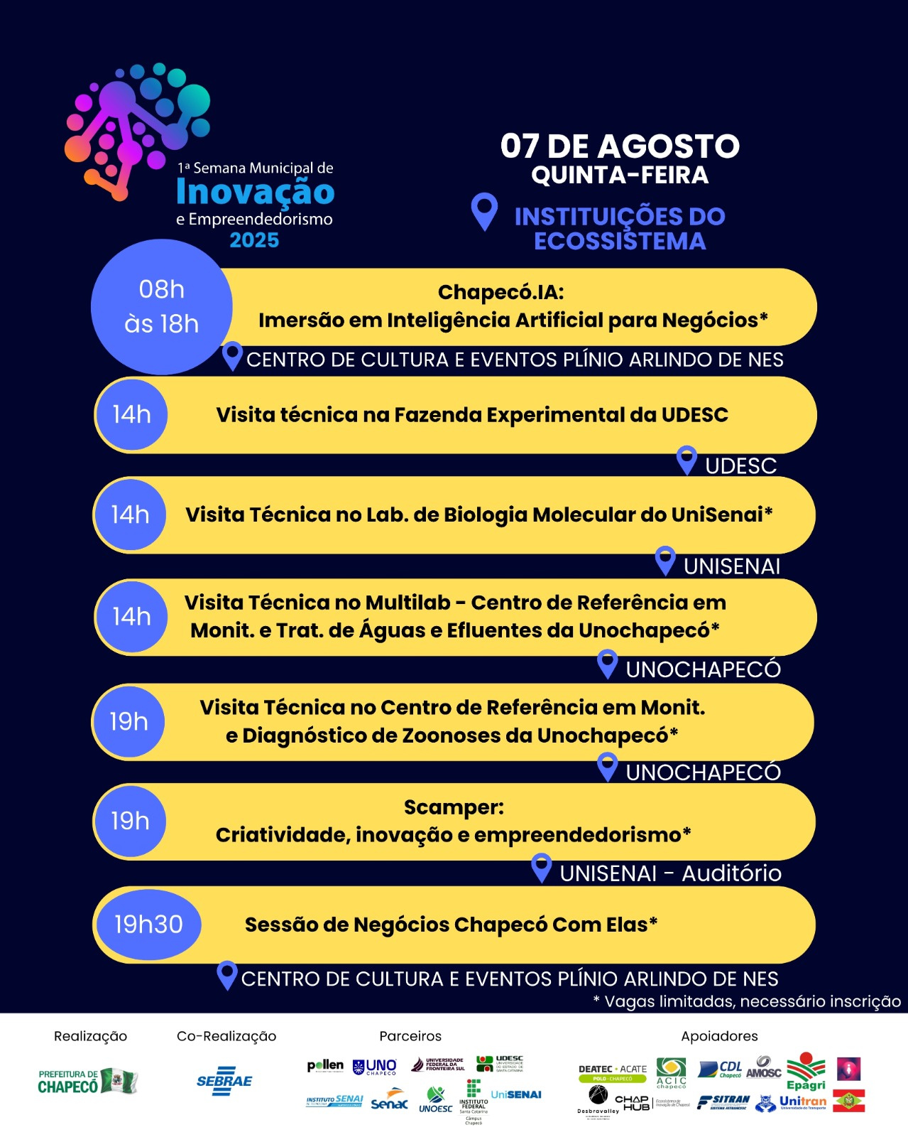 A abertura da semana está prevista para o dia 04 de agosto, às 19h, com a presença de autoridades e na sequência palestra magna com Magno Maciel, pesquisador com passagem pela OpenAI (criadora do ChatGPT), sobre a inteligência artificial como tecnologia estruturante para o desenvolvimento do país. No dia 05, haverá imersão em Inovação no Agronegócio, com foco em tecnologias, pesquisas e soluções voltadas à produção sustentável e segurança alimentar, com participação da Epagri, universidades e empresas. Painel: Cenários da Inovação em Chapecó - Márcio da Paixão e convidados. Painel Internacional de Inovação Social com Oscar Santiago Uribe Rocha, ex-diretor de Resiliência de Medellín, Colômbia. No dia 06, estão previstas oficinas de IA para profissionais da saúde e imersão em compras públicas para inovação. Já no dia 07, a partir das 8h, acontecerá imersão em Inteligência Artificial para Negócios, com workshops, experiências e demonstrações aplicadas. E no último dia, 08 de agosto, haverá encerramento com evento sobre inovação e empreendedorismo na área da estética, reunindo profissionais, marcas e tendências do setor.