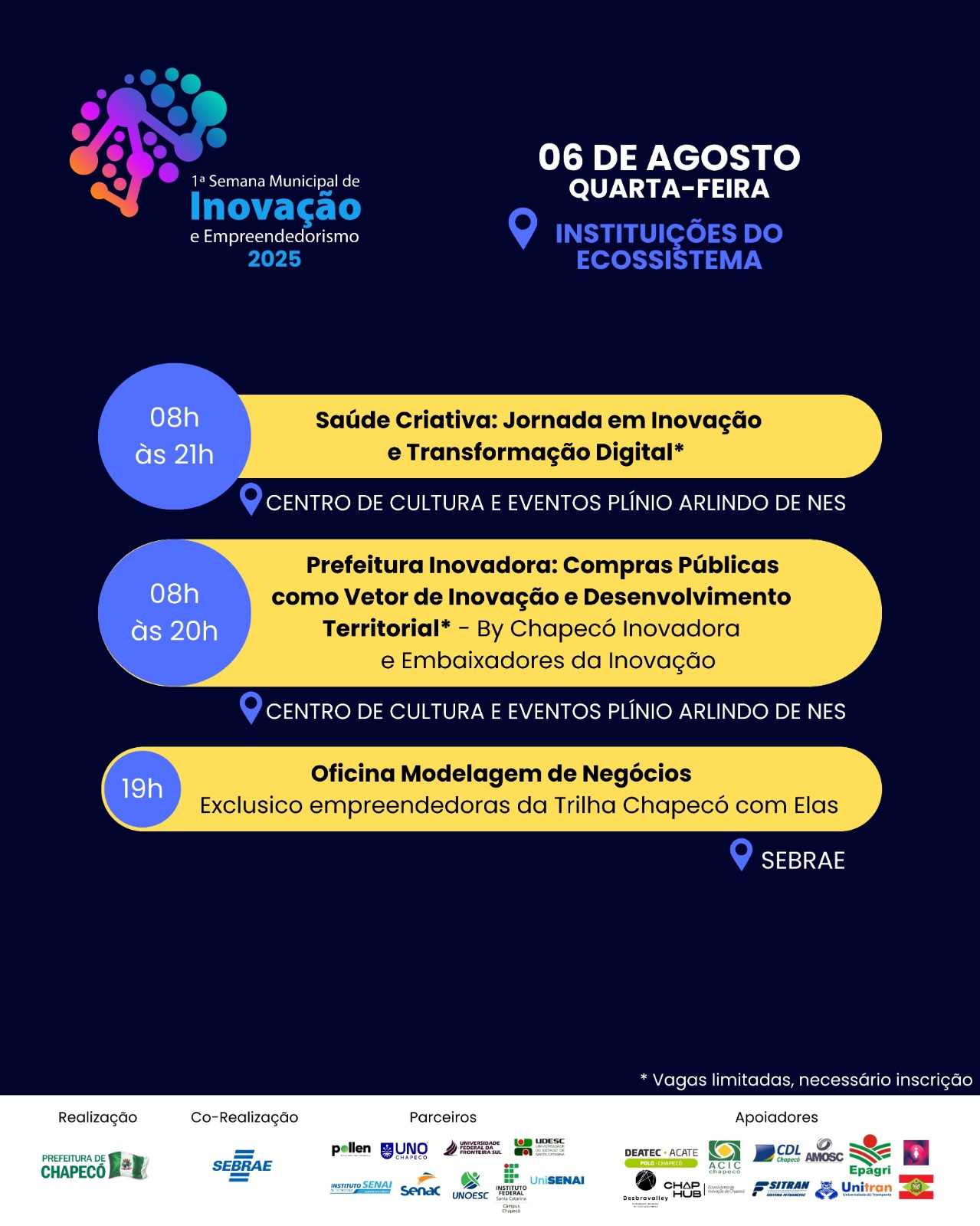 A Prefeitura de Chapecó, por meio da Secretaria de Desenvolvimento Econômico, Turismo e Inovação, realiza de 04 a 08 de agosto, em Chapecó, a Primeira Semana Municipal de Inovação e Empreendedorismo. O evento que acontecerá no Centro de Eventos Plínio Arlindo de Nes, conta com apoio das universidades, empresas, instituições públicas, entidades setoriais e organizações da sociedade civil que compõem o ecossistema local de inovação.