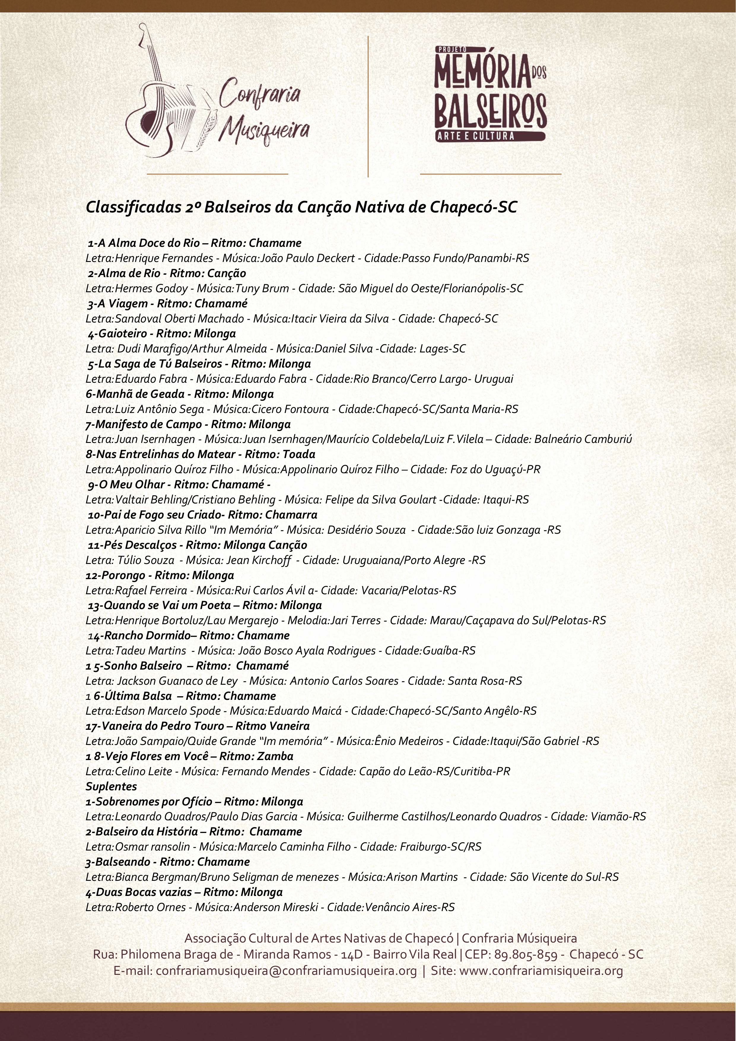Mais de 500 músicas foram ouvidas pela comissão avaliadora do 2º Balseiros da Canção Nativa e após criteriosa avaliação de uma experiente banca composta por Taine Schettert, Rafael Simioni, Marcos Damasceno, Cláudio Patias e Gaudério Gabriel foram selecionadas as canções, que serão apresentadas no palco do Festival por artistas dos três estados do Sul e também do Uruguai.