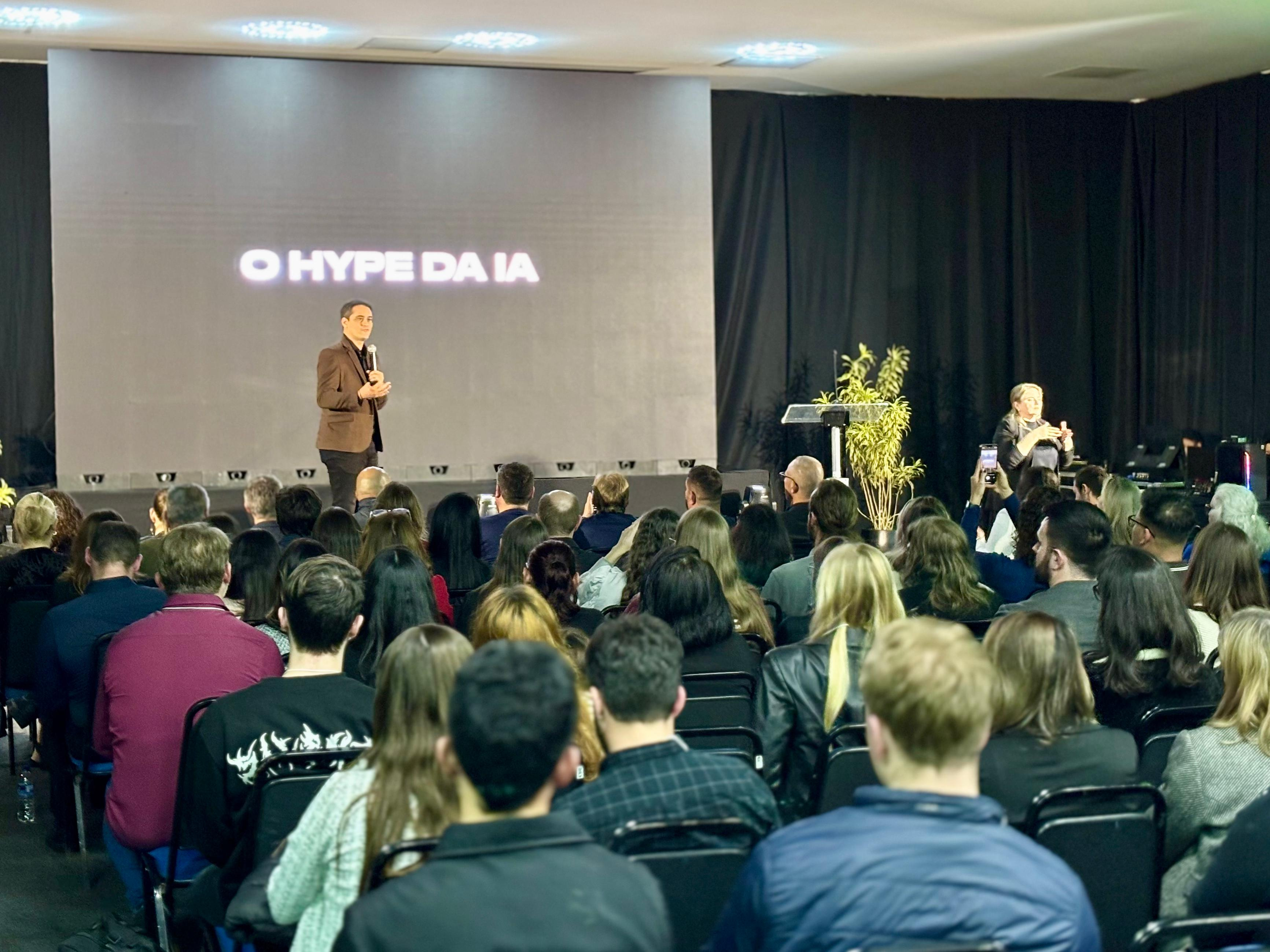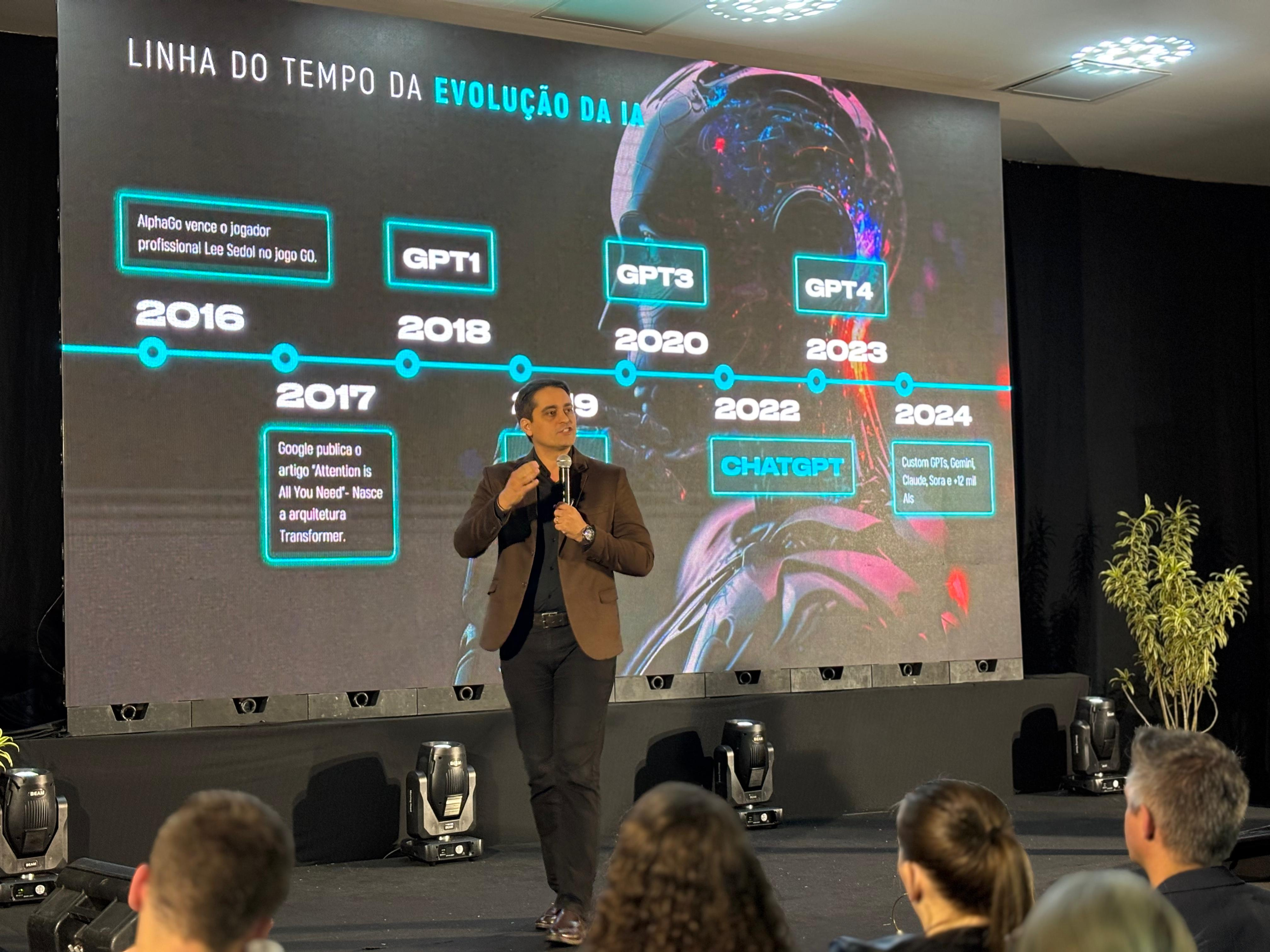 Depois da abertura oficial ocorreu a palestra de abertura, com Magno Maciel, pesquisador com passagem pela OpenAI (criadora do ChatGPT), sobre IA como tecnologia estrutural: o alicerce do futuro.