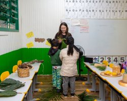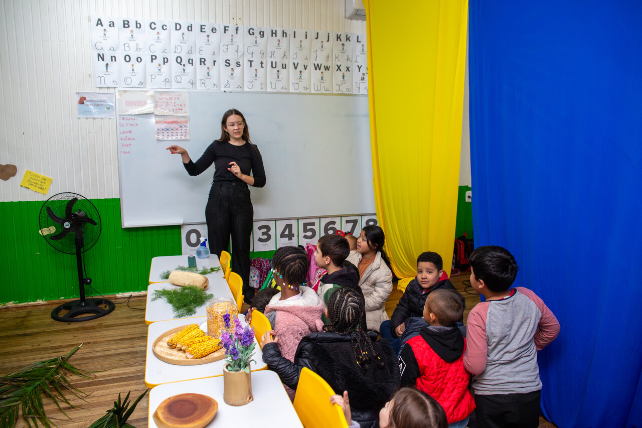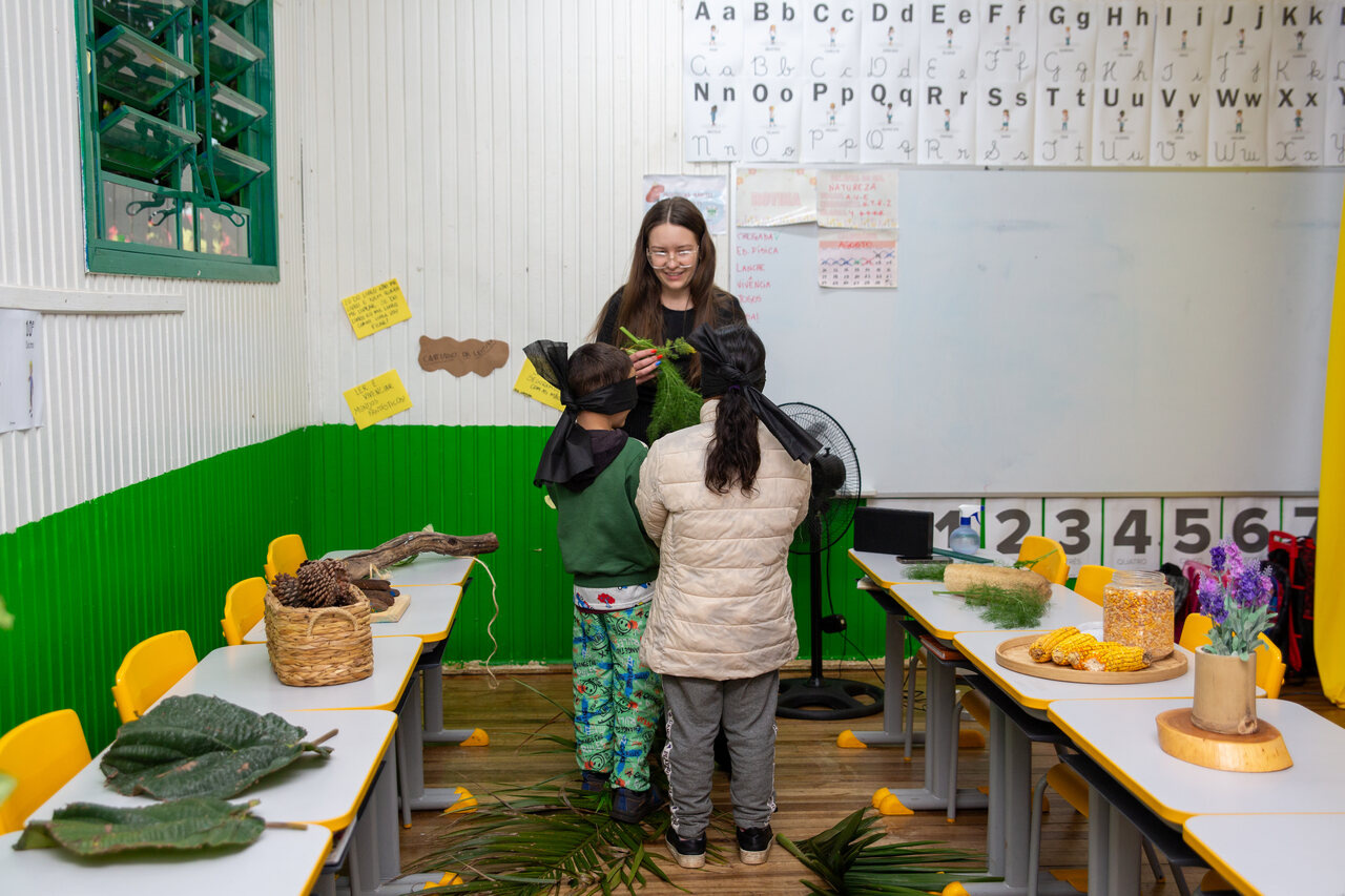 Construímos essa vivência com um primeiro espaço com elementos naturais, que vem da natureza, com o som tranquilo, o som de animais, com o vento no rosto para sentir a brisa. E um segundo espaço com tudo aquilo que a gente vive na cidade, com os cheiros, o barulho, aquele ar quente, representando a atmosfera de poluição. Tudo isso para demonstrar para eles, de uma forma lúdica, como funciona cada uma dessas paisagens, explicou a professora Manoeli.