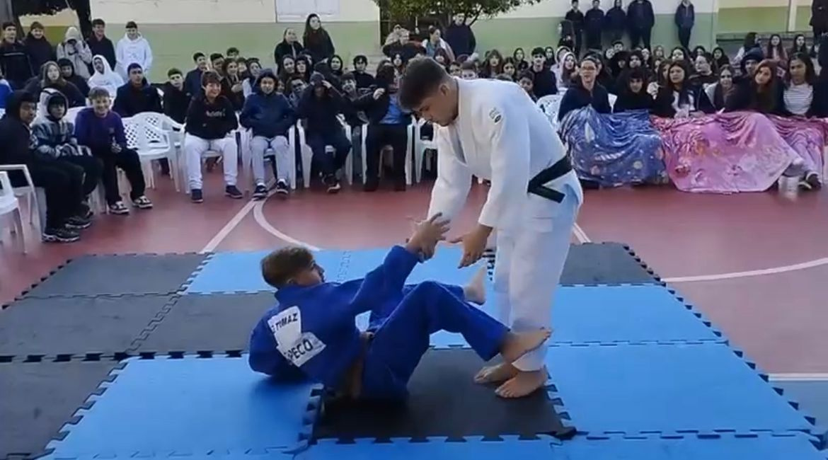 Aluno do 2º ano e atleta da Prefeitura de Chapecó demonstra técnicas e destaca valores de disciplina, respeito e defesa pessoal. O Dia do Estudante ganhou um toque especial na Escola Zélia Scharf, em Chapecó. Entre apresentações artísticas e momentos de confraternização no tradicional show de talentos, um dos destaques ficou por conta do aluno do 2º ano do ensino médio, Guilherme Tomaz, que também é atleta de judô da Prefeitura de Chapecó pelo Programa Atleta do Futuro. Com o kimono branco e postura firme, ele apresentou para os colegas e professores uma série de técnicas e golpes, mostrou que o judô vai muito além das competições.