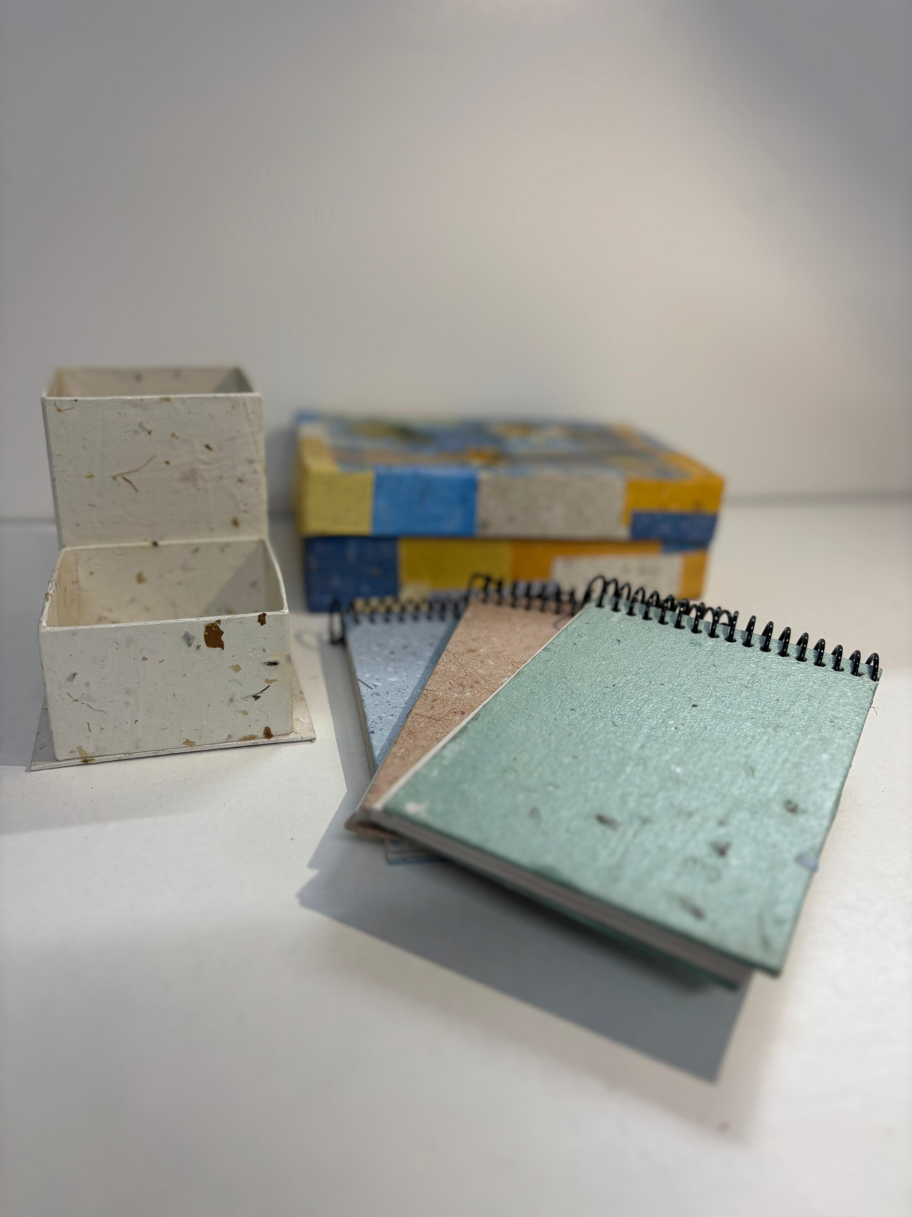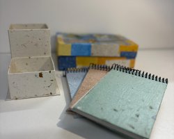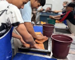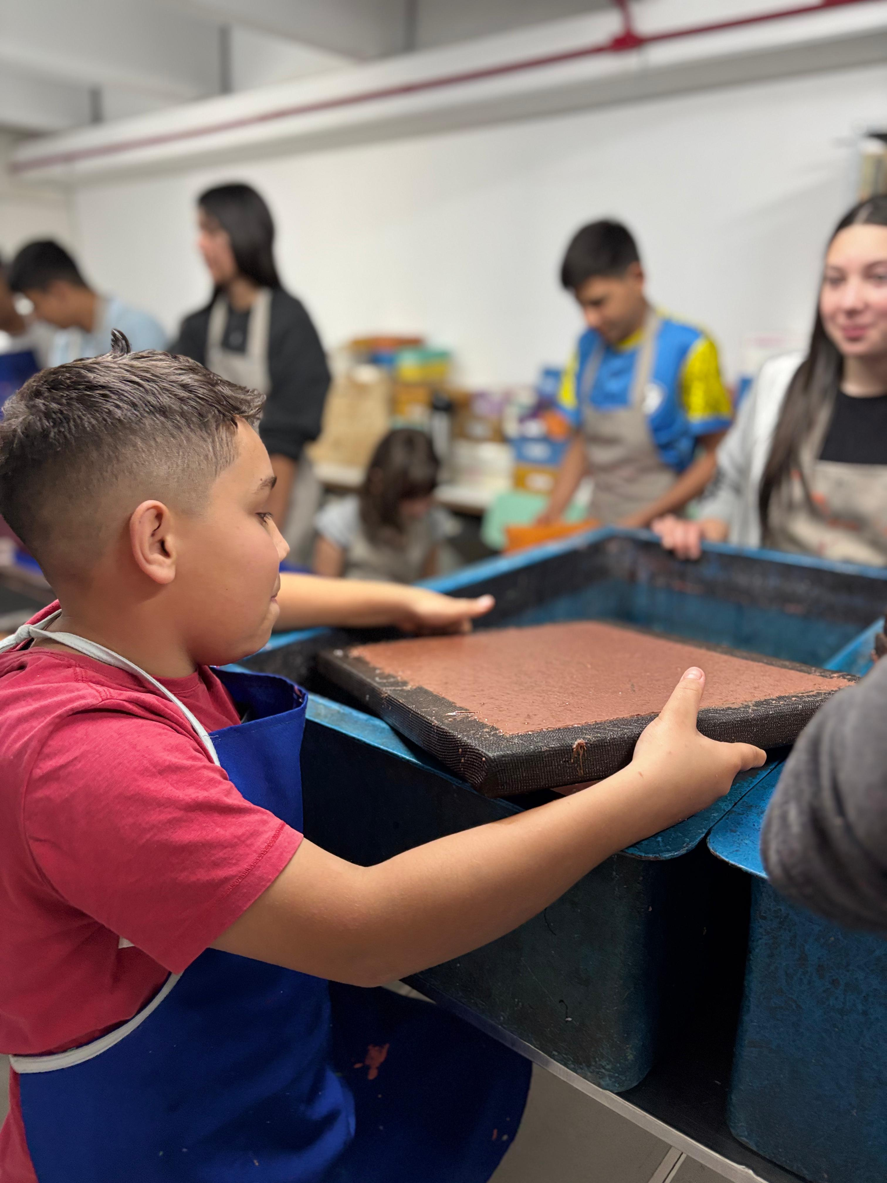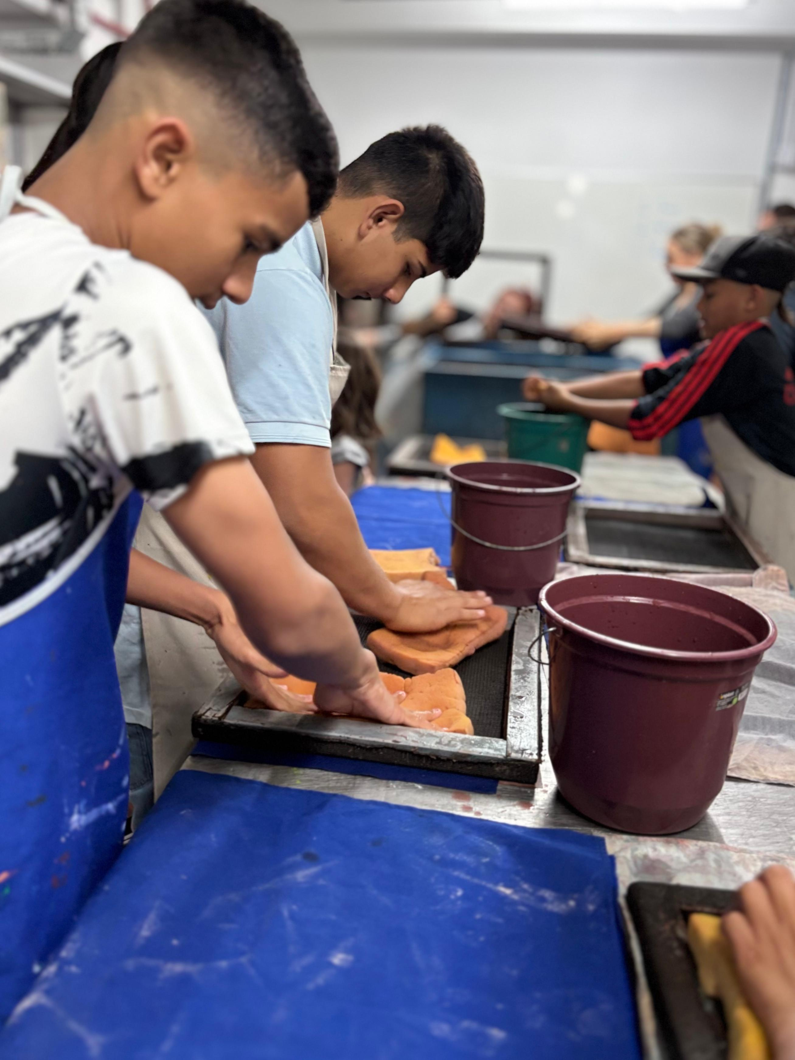 Durante as sessões, os participantes aprendem todas as etapas do processo artesanal, desde a seleção e trituração do papel usado até a prensagem e secagem das novas folhas. O resultado são folhas de papel reciclado com textura rústica e única, que ganham uma nova vida nas mãos dos jovens artistas. Essas folhas são utilizadas em outras oficinas, como a de cartonagem, para a confecção de cadernos, blocos de anotação, agendas e caixas.