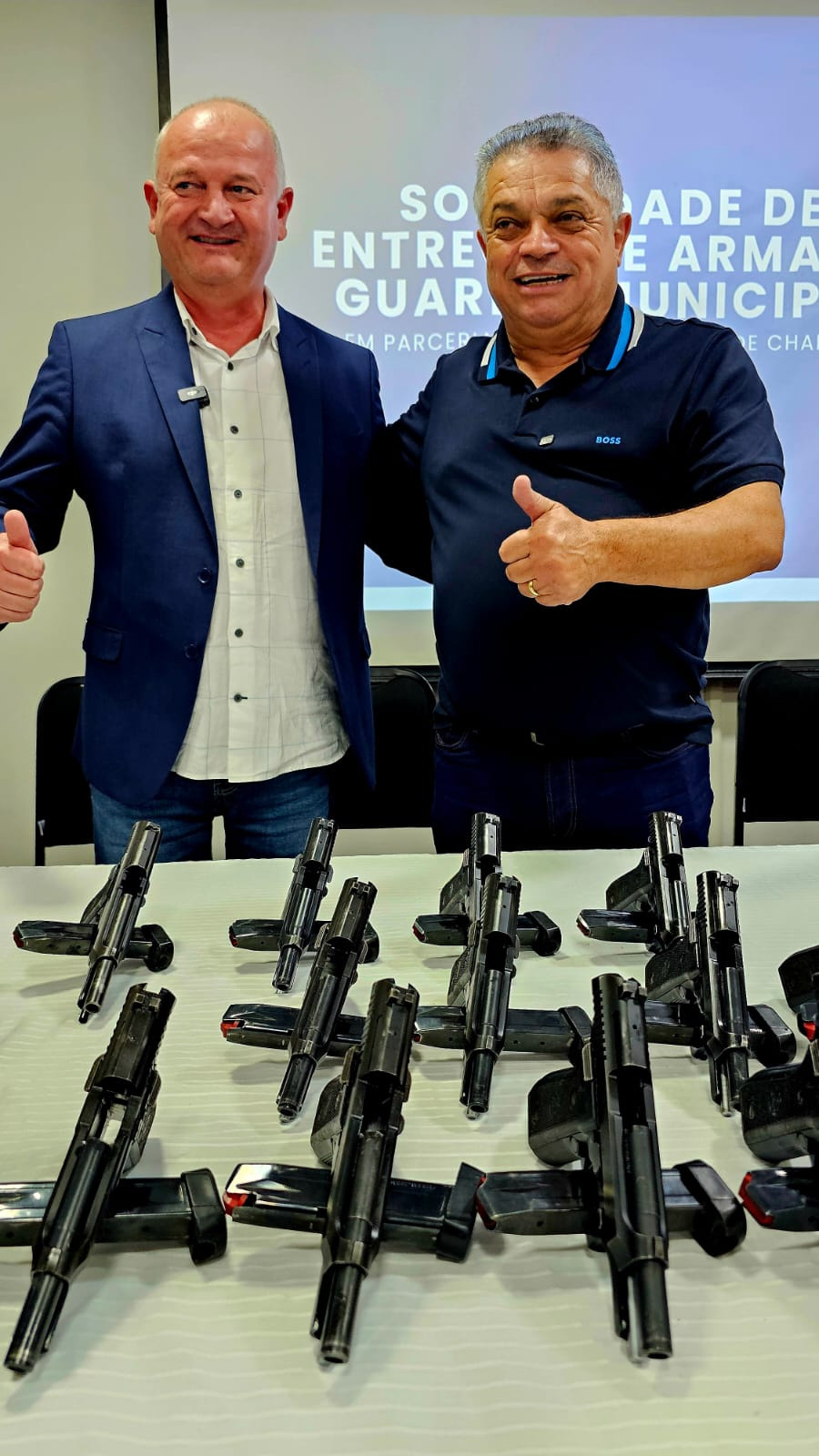A Prefeitura de Chapecó, por intermédio da Secretaria de Segurança Pública e Guarda Municipal realizou nesta quarta-feira (20), a doação de 30 pistolas ao Poder Público de Araquari, sendo 25 pistolas Taurus calibre .380 e 5 pistolas Taurus calibre .40.A solenidade de doação foi na Prefeitura de Araquari, com a presença do prefeito de Chapecó, João Rodrigues.