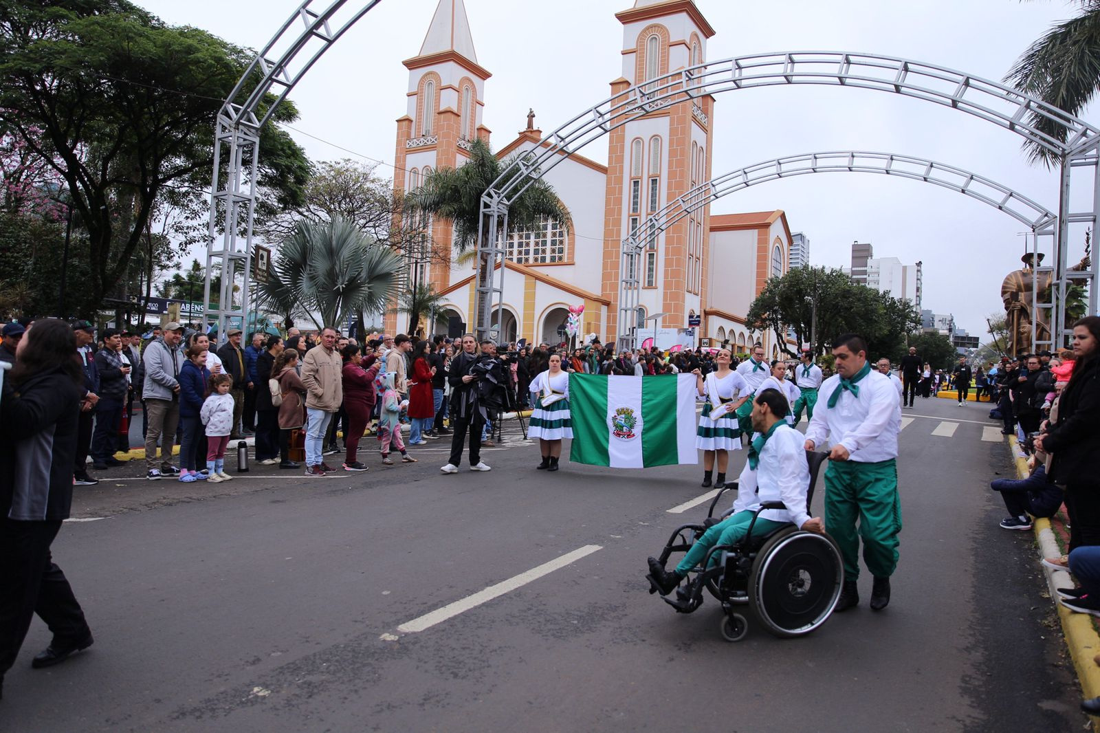A Prefeitura de Chapecó, por meio da Secretaria de Cultura, promoveu nesta segunda-feira, 25 de agosto, um desfile comemorativo ao aniversário de 108 anos de emancipação político-administrativa do município. Representantes de 29 entidades passaram pela Avenida Getúlio Vargas, mostrando o trabalho realizado na sociedade. Mesmo com o frio um bom público esteve presente. Silvério Zornitta, 39 anos, fez um chimarrão para esquentar e foi com as duas filhas assistir, pois sua esposa desfilou junto com a APAE, que fez até uma apresentação de dança.