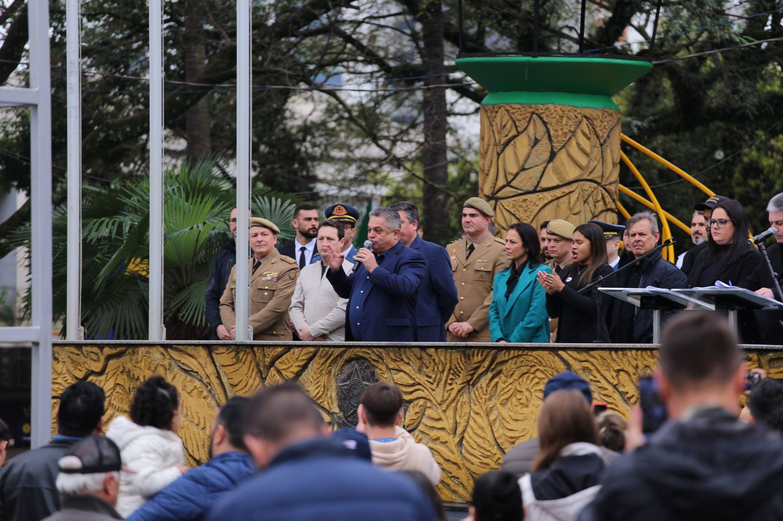 O presidente da Câmara de Vereadores, Claimar de Conto, falou em nome de Chapecó destacando o desenvolvimento do município. Também estiveram presentes a primeira dama, Fabiana Matte Rodrigues, o vice-prefeito, Valmor Scolari, secretários e comandantes e representantes das Forças de Segurança, além de presidentes de entidades. A Fanfarra Clube Desbravadores e Aventureiros abriu o desfile. Gustavo Pedroso, 19 anos, estava à frente levando a bandeira de Chapecó. "Já desfilei outras vezes mas é a primeira fez que levo a bandeira. Fui voluntário pra carregá-la pois sinto orgulho em dizer que sou chapecoense. Nossa cidade é muito boa", disse Gustavo.