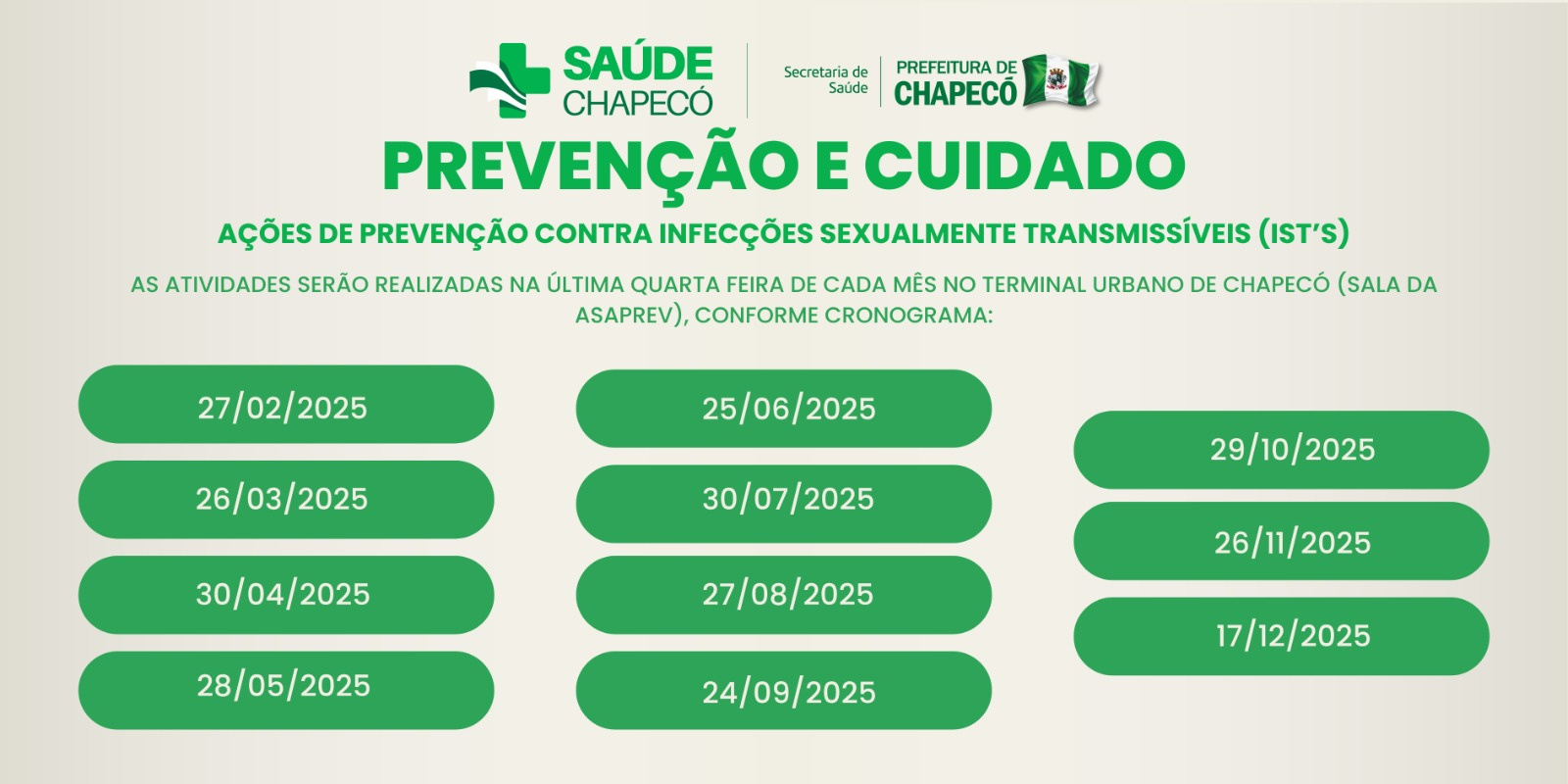 A Prefeitura de Chapecó, por meio da Secretaria de Saúde, realiza nesta quarta-feira (27), mais uma ação de testagem rápida para HIV, sífilis, hepatite B e hepatite C, com foco na prevenção às Infecções Sexualmente Transmissíveis (ISTs) HIV/AIDS. O horário será das 13h às 17h, no Terminal Urbano, na sede da ASAPREV.