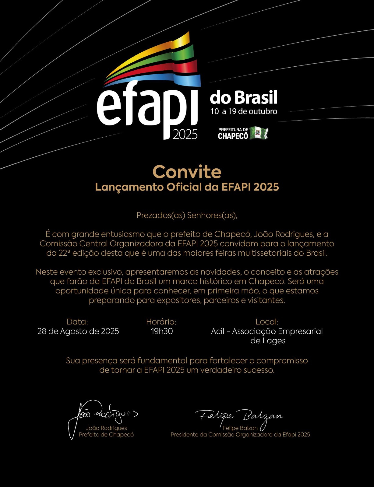 A Efapi do Brasil, uma das maiores feiras multissetoriais do Brasil, que é realizada a cada dois anos, em Chapecó, será lançada em Lages, nesta quinta-feira (28), às 19h30, na Associação Empresarial (ACIL). O acesso é para imprensa e autoridades, mediante convite individual.