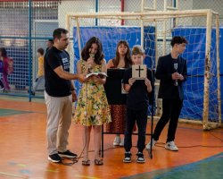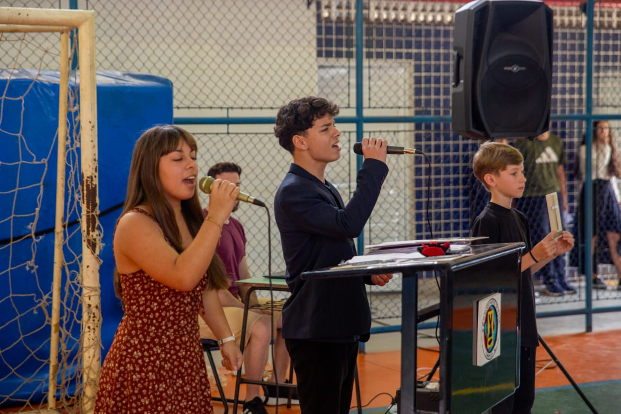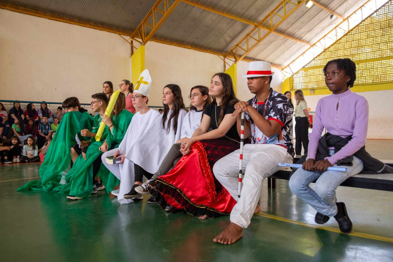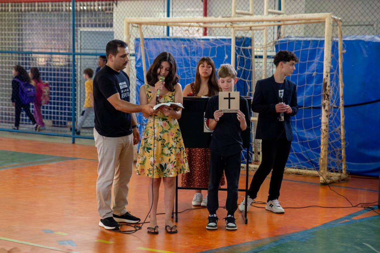 Na semana que passou, as turmas de oitavo ano da EBM Diogo Alves da Silva, sob a orientação do professor Cleberson Schneider, realizaram um painel de Ensino Religioso que contou com apresentações culturais e musicais, e teve como objetivo apresentar aos estudantes as práticas e crenças de seis religiões diferentes, destacando a importância do respeito e da diversidade religiosa.
