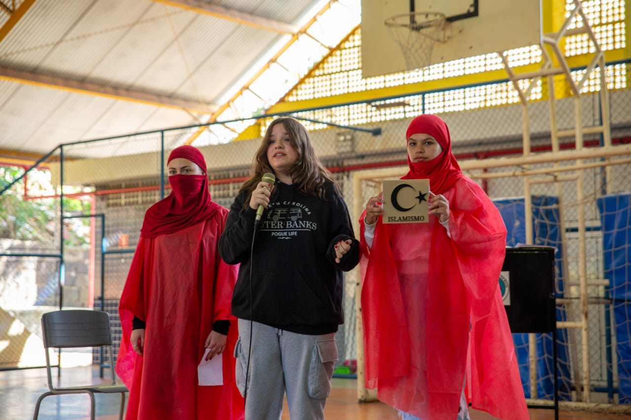 Cada grupo de estudantes se dedicou a pesquisar sobre uma religião específica, trazendo informações, tradições, vestimentas e rituais que a compõem. Como parte das apresentações, os alunos também interpretaram músicas representativas das religiões escolhidas. O painel destacou a diversidade religiosa, o respeito às tradições e o diálogo como forma de promover compreensão, convivência pacífica e a cultura de paz na escola, reforçando o acesso ao conhecimento religioso como patrimônio da humanidade, destacou o professor Cleberson.