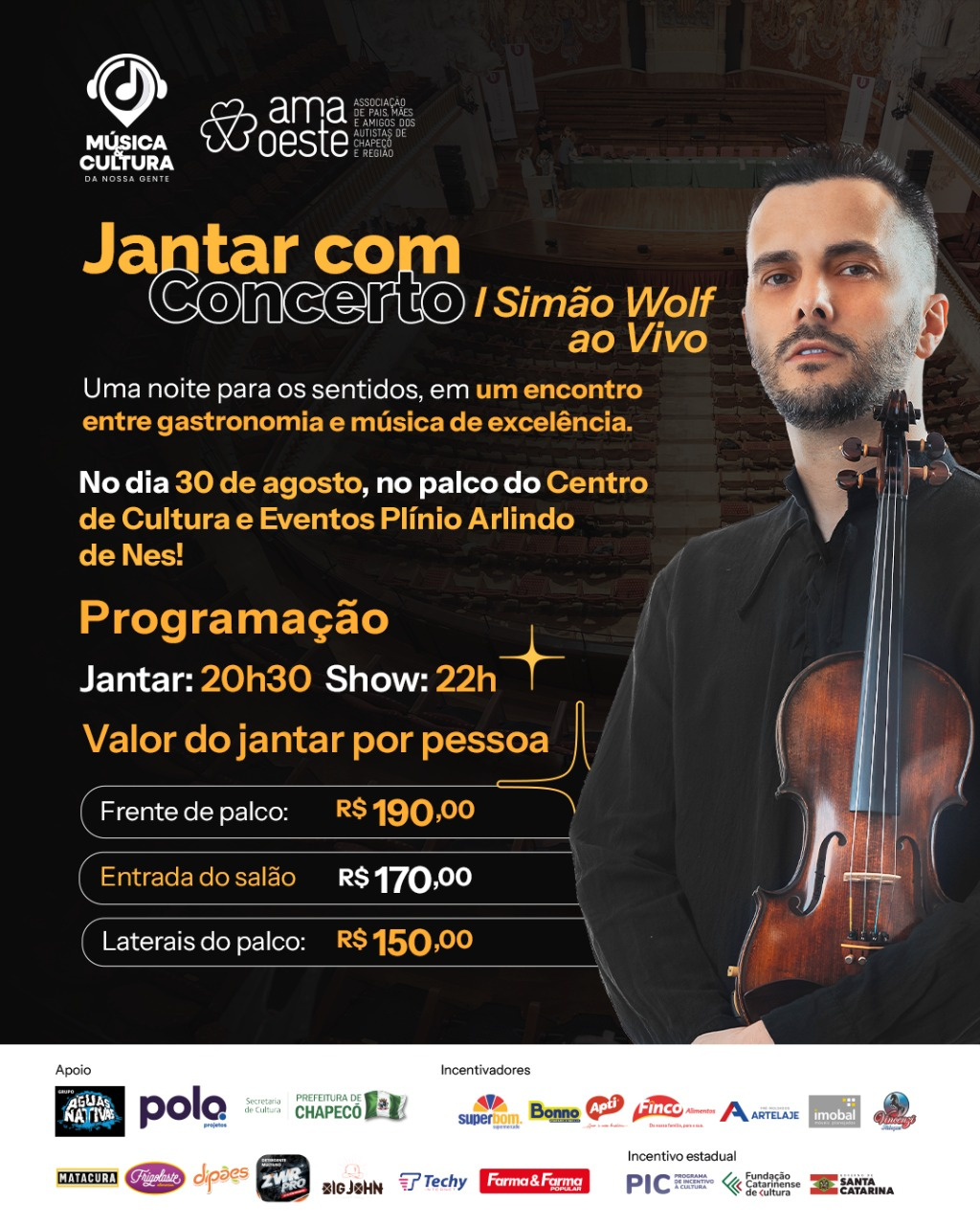 Os ingressos, que variam de R$150 a R$190, podem ser adquiridos no link: https://lets.events/e/jantar-beneficiente-com-show-do-violinista-simao-wolf.