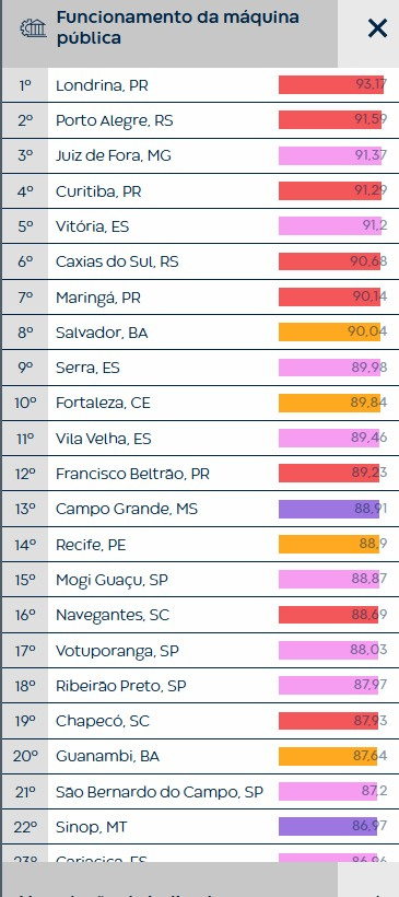 O indicador de Funcionamento da Máquina Pública, onde Chapecó ficou entre os vinte melhores, está dentro da dimensão Instituições, na qual Chapecó ficou na 6ª posição nacional. Outro indicador de Instituições é Sustentabilidade Fiscal, no qual a maior cidade do Oeste ficou entre os 24 melhores.