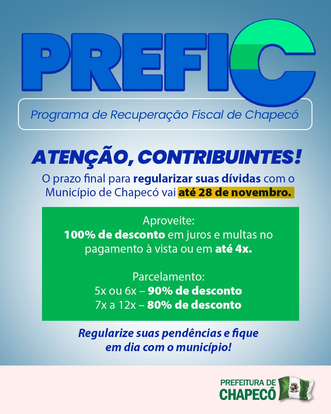 A prefeitura de Chapecó, por meio da secretaria de Fazenda, lembra que o prazo para adesão ao Programa de Recuperação Fiscal (PREFIC) vai até o dia 28 de novembro de 2025.